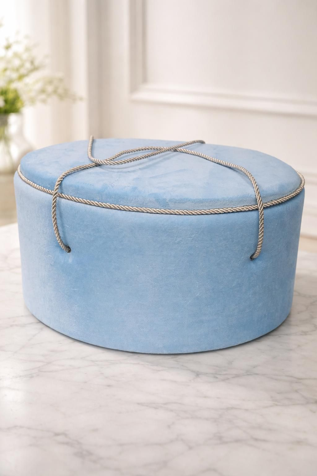 Este confecționat dintr-un material catifelat, de culoare bleu deschis, cu detalii rafinate care inspiră puritate și delicatețe. Capacul rotund este decorat simplu.