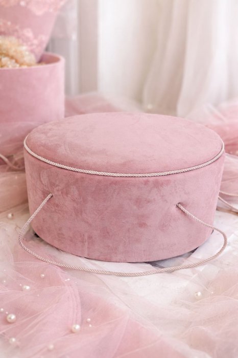 Este confecționat dintr-un material catifelat, de culoare roz deschis, cu detalii rafinate care inspiră puritate și delicatețe. Capacul rotund este decorat simplu.