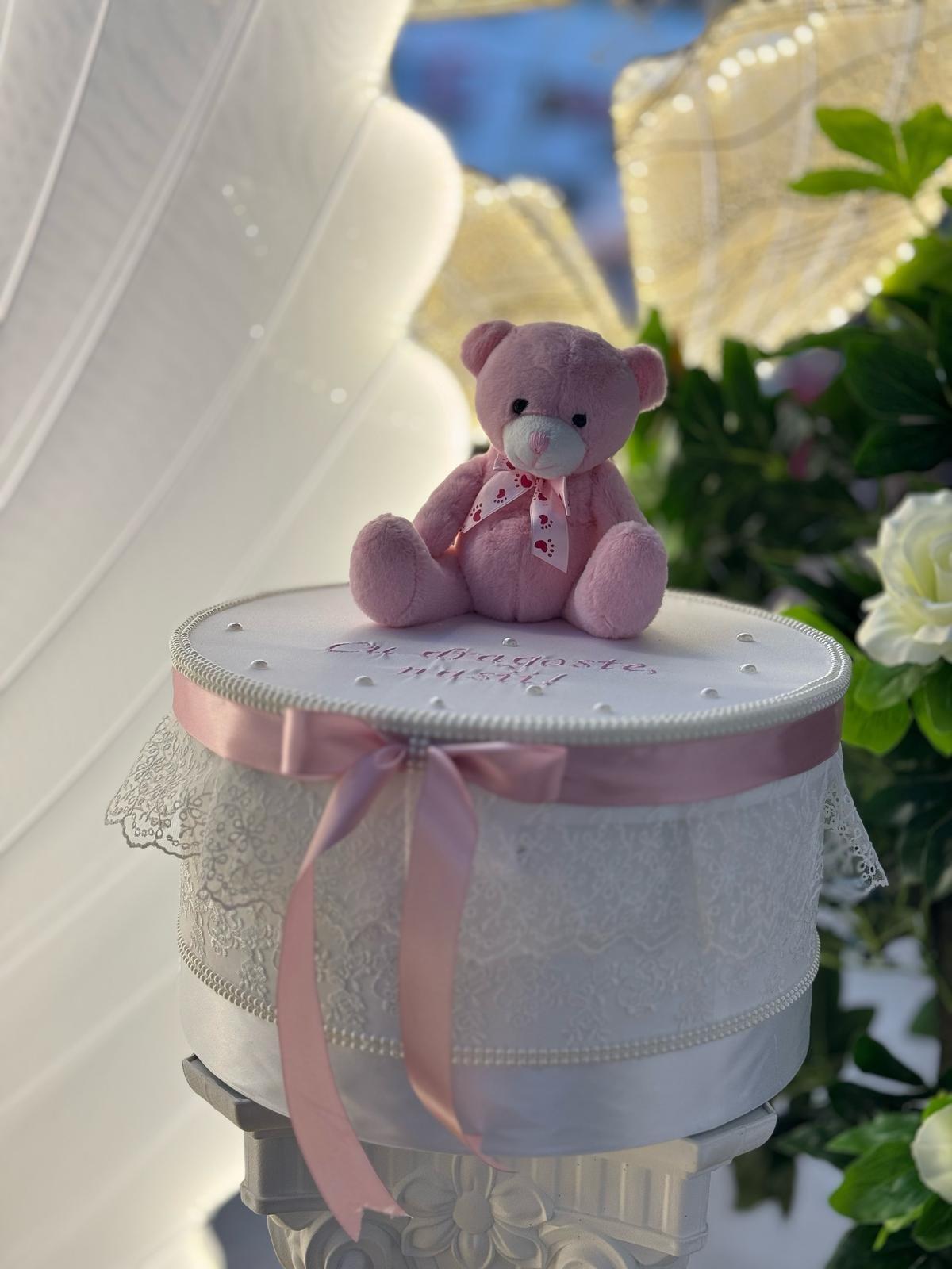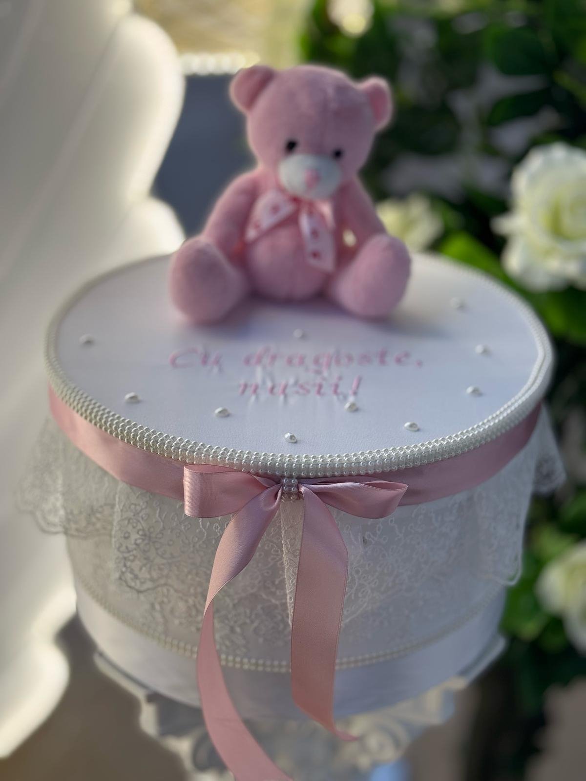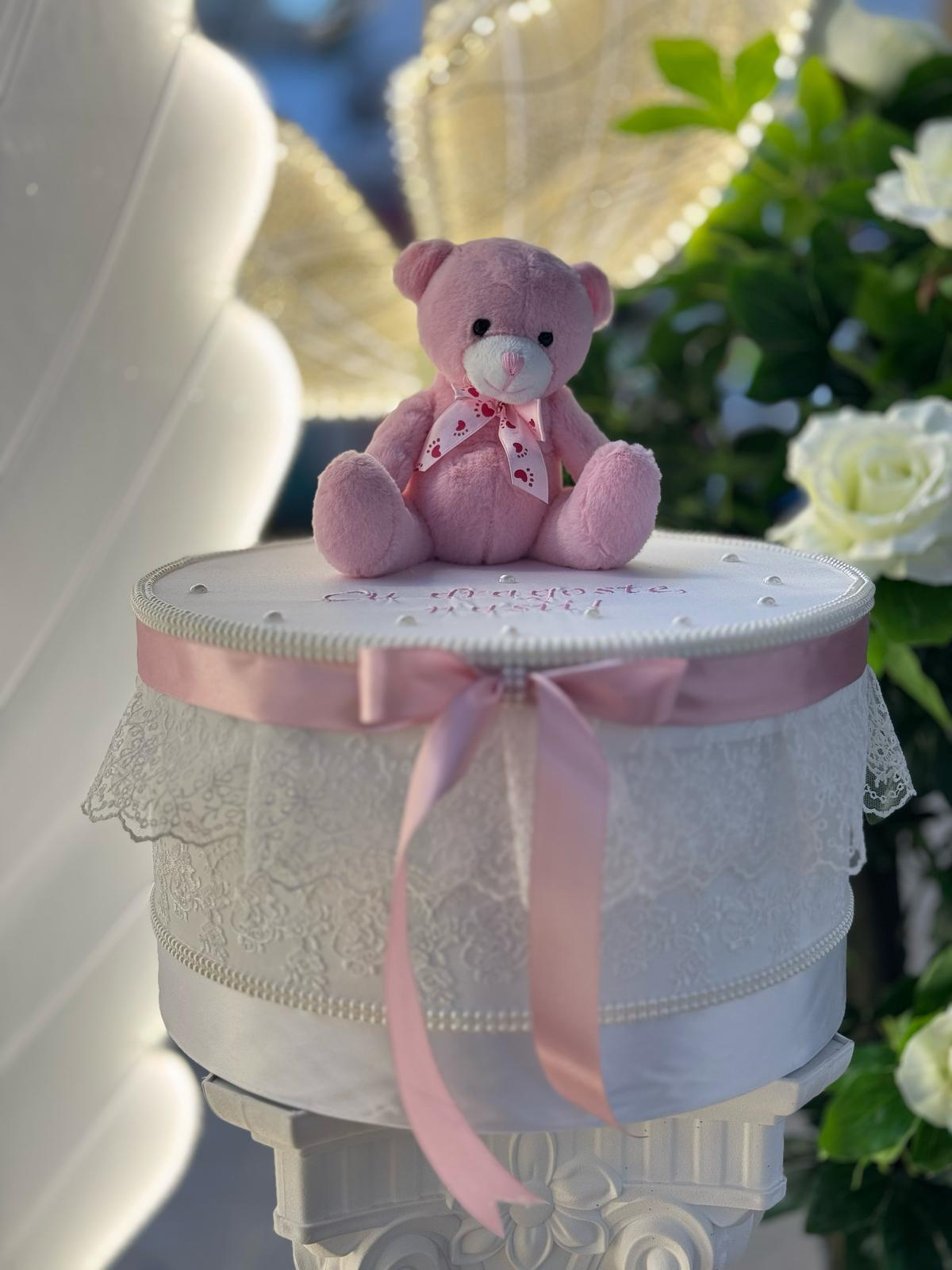 Тази нежна кутия за кръщене е перфектният избор да запазите спомените от най-емоционалния ден в живота на вашето мъниче. Изработена с внимание към детайла, кутията е облечена в бял сатен и фина дантела, декорирана с бледорозова панделка и очарователно плюшено мече, поставено отгоре.