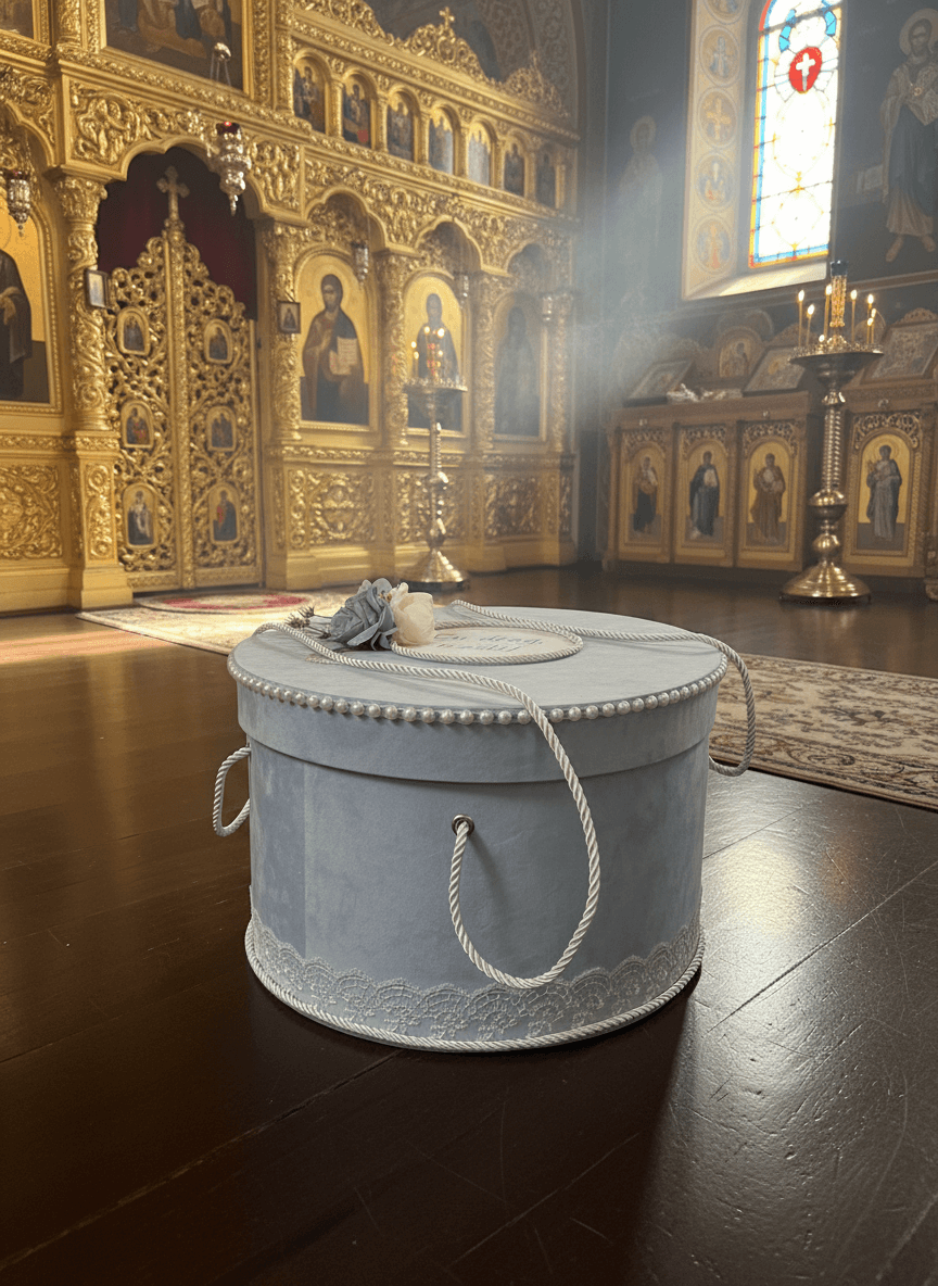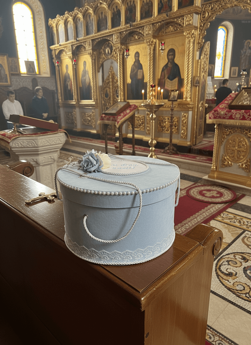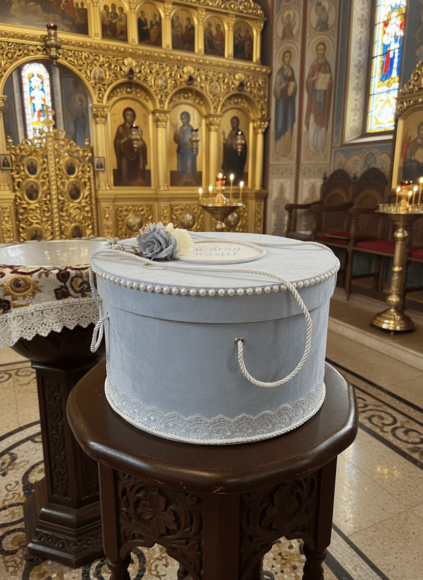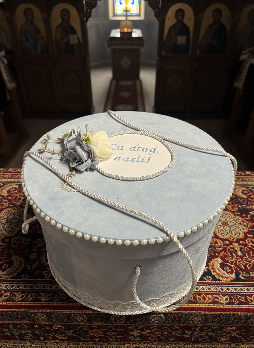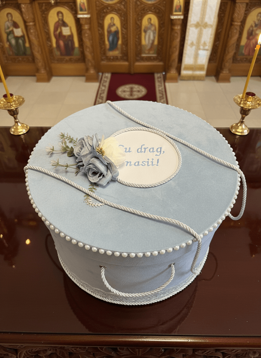 Изработена е от кадифен, светлосин материал, с изискани детайли, които вдъхновяват чистота и деликатност. Кръглият капак е украсен с низ от фини перли и текстилни цветя в пастелни тонове, предлагащи нотка на изтънченост и символика. По ръба бяла дантела хармонично допълва дизайна, а дръжките, изработени от сплетено бяло въже, я правят лесна за носене.