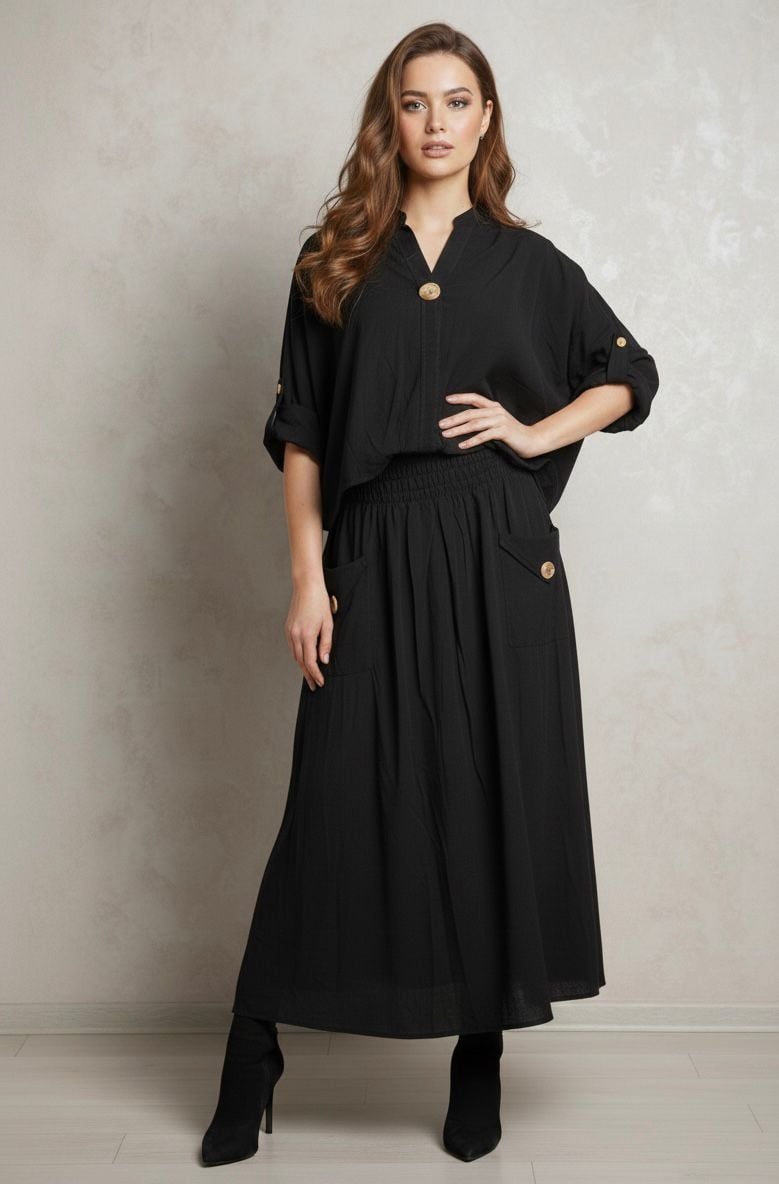 Полата, изработена с разкроена камбанка, е с дължина 83 см и приляга добре в талията, от 86 см в неразтегнато състояние до максимум 140 см в разтегнато състояние. Снабдена е със странични джобове, практичен и модерен детайл, без да се прави компромис с изискания вид.