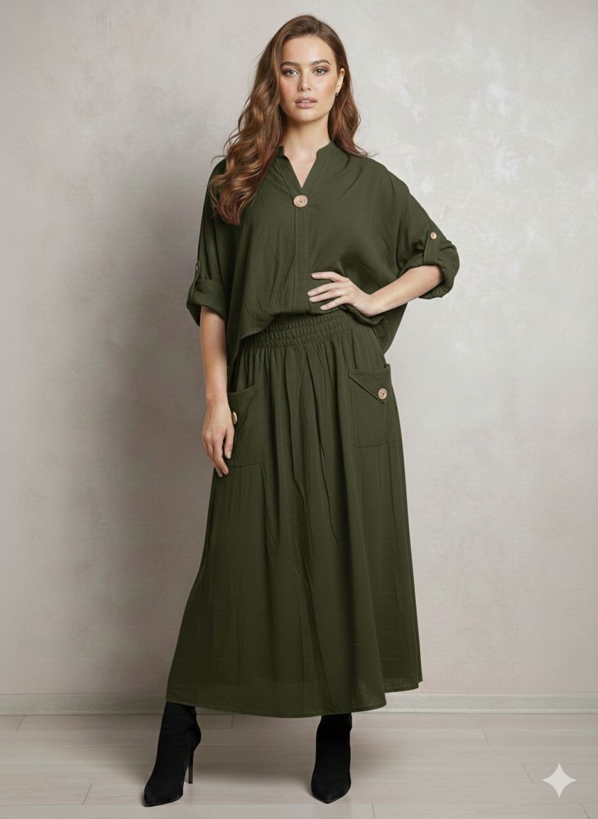 Този костюм в цвят каки на райета перфектно съчетава комфорта с изискаността на естествения тоалет. Блузата е със свободна кройка, с обиколка на бюста 125 см и дължина 61 см, което я прави подходяща за спокойно и елегантно носене.