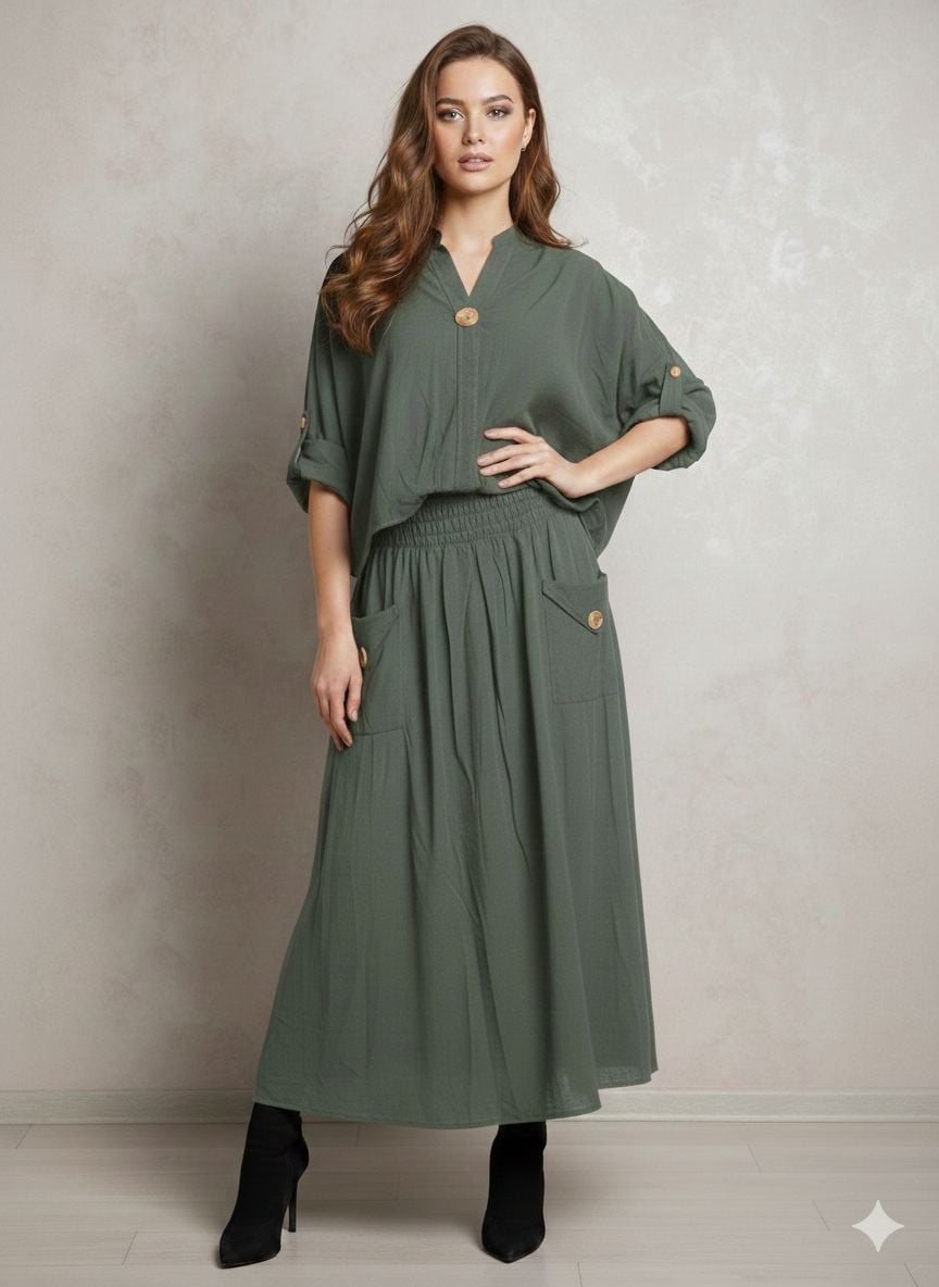 Този костюм в цвят каки на райета перфектно съчетава комфорта с изискаността на естествения тоалет. Блузата е със свободна кройка, с обиколка на бюста 125 см и дължина 61 см, което я прави подходяща за спокойно и елегантно носене.