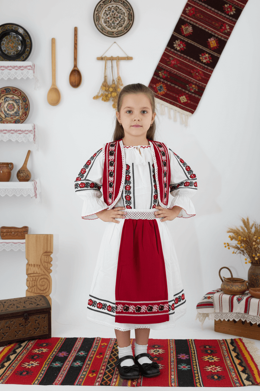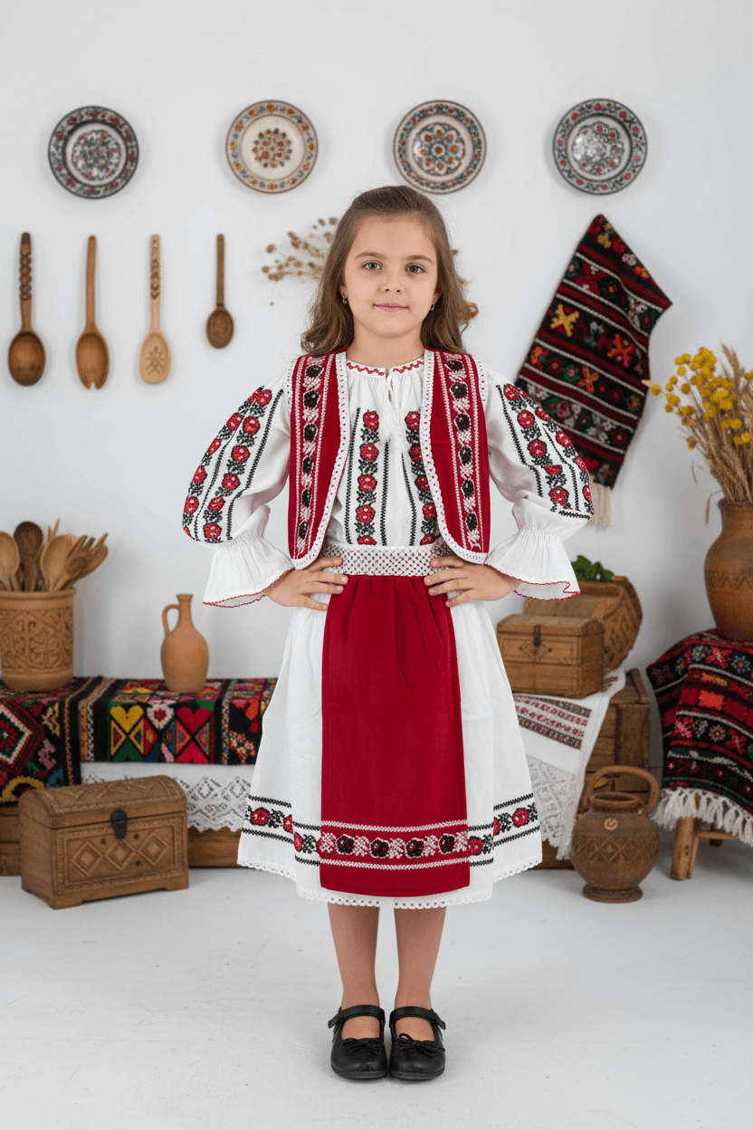 6 – за деца между 6-8 години (обиколка на блузата - 72 см, дължина на блузата - 50 см, дължина на ръкава - 43 см; дължина на полата - 42 см, талия на полата 52 см, разтяга се до 72 см, обиколка на потника 66 см, дължина 30 см)