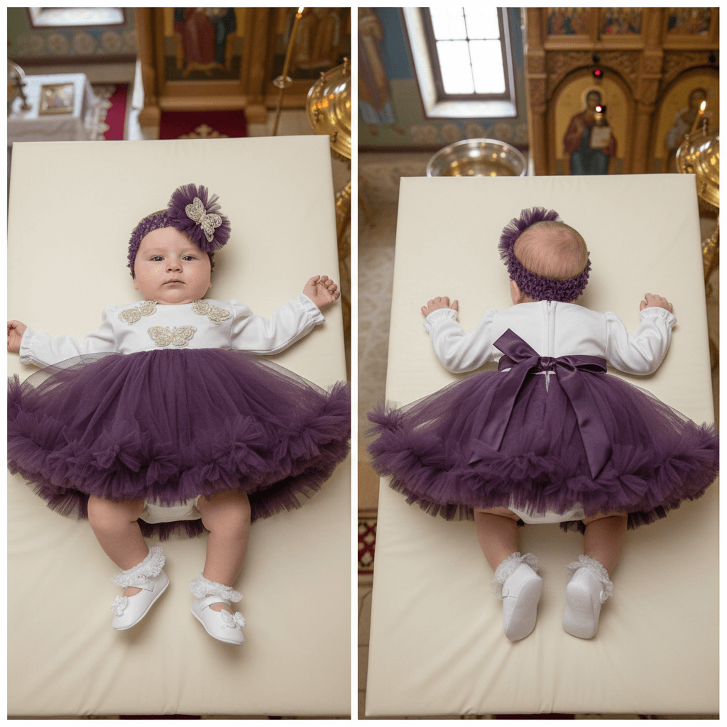 Голямата панделка на гърба и съответстващата лента за глава перфектно допълват облеклото, предлагайки празнична визия, идеална за кръщенета, рождени дни или фотосесии.