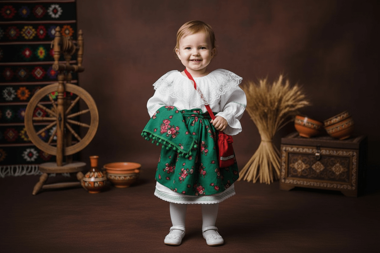 Традиционен костюм за момиченца бебета: 0-12 месеца, състоящ се от 4 части: традиционна риза, пола, кърпа и торба. Костюм с традиционни мотиви от румънския фолклор, изработен с много внимание.