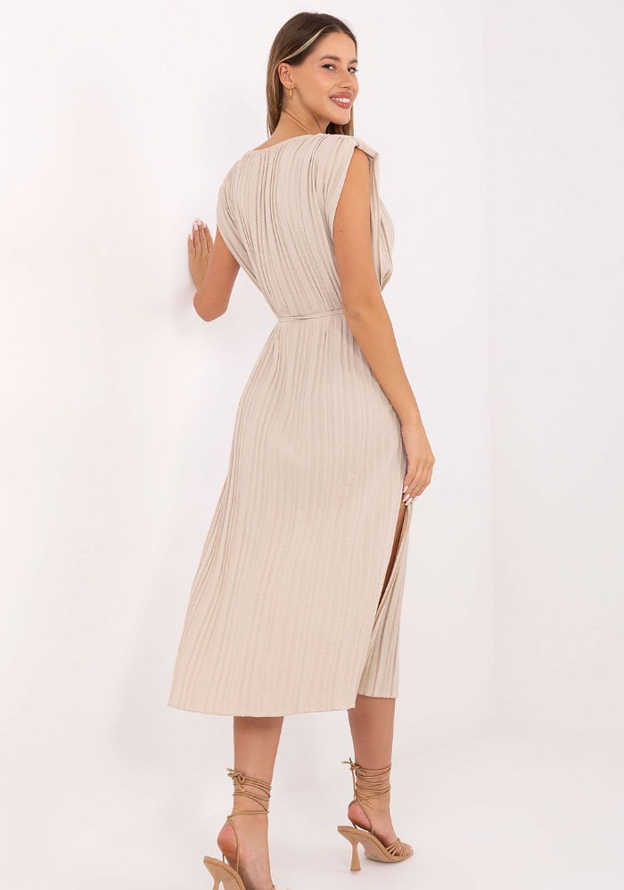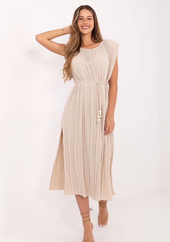 Лятна миди рокля, изработена от лек и удобен материал с плисирана текстура, идеална за топлите дни. Моделът без ръкави с кръгло деколте фино подчертава раменете, а пришитите подплънки създават елегантна и женствена линия. Страничните разрези в долната част предлагат лекота и свобода на движение, което прави тази рокля идеален избор за комфорт и стил.
