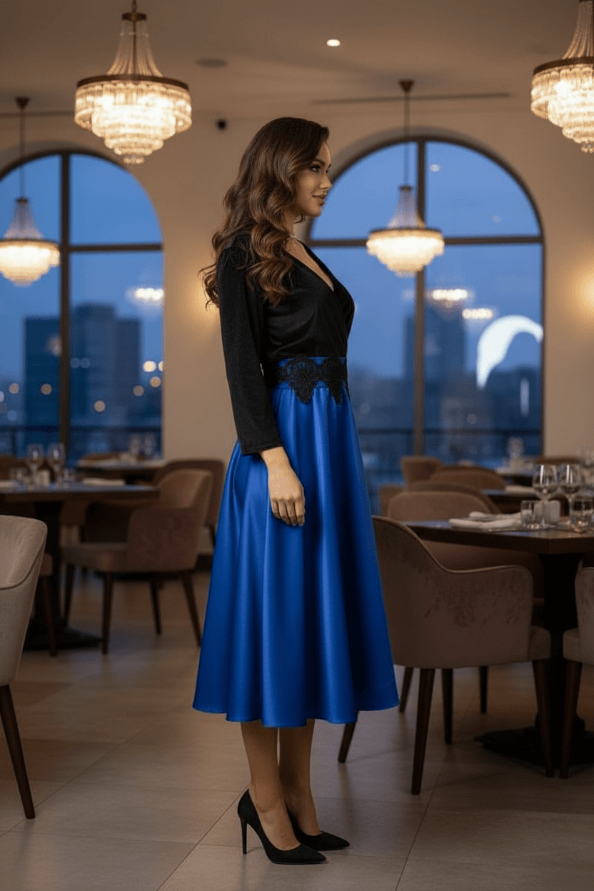 Елегантна рокля с кадифе и тафта. Подходяща е за всеки повод. Талията е с ластик, който осигурява лекота. Коланът е изработен от имитация на кожа и е сваляем. Ръкавите са 3/4.