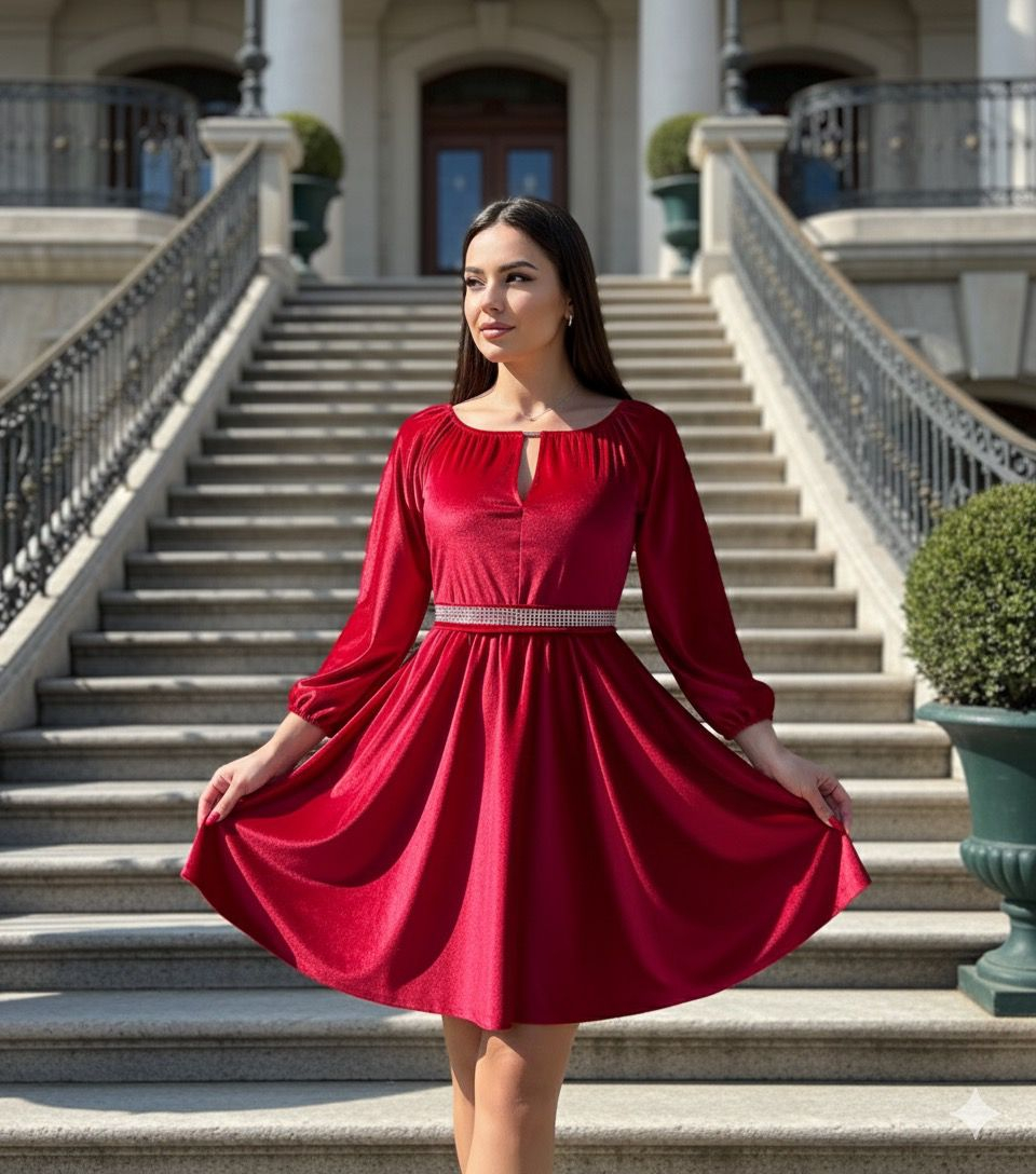 Rochie eleganta din catifea. Este potrivita pentru orice ocazie. In talie si la decolteu este prevazuta cu elastic, ce ofera lejeritate. Cureaua este din acelasi material cu flori din material si este detasabila.Manecile sunt  3/4 stil clopot .