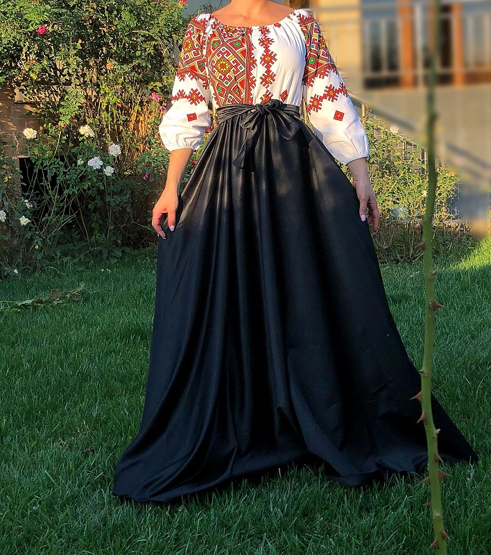 Rochie eleganta stilizata din panzica cu aspect de in cu imprimeu motive traditionale si tafta. Este potrivita pentru orice ocazie. In talie si la decolteu este prevazuta cu elastic, ce ofera lejeritate. Cureaua este din acelasi material si este detasabila.Manecile sunt 3/4.
