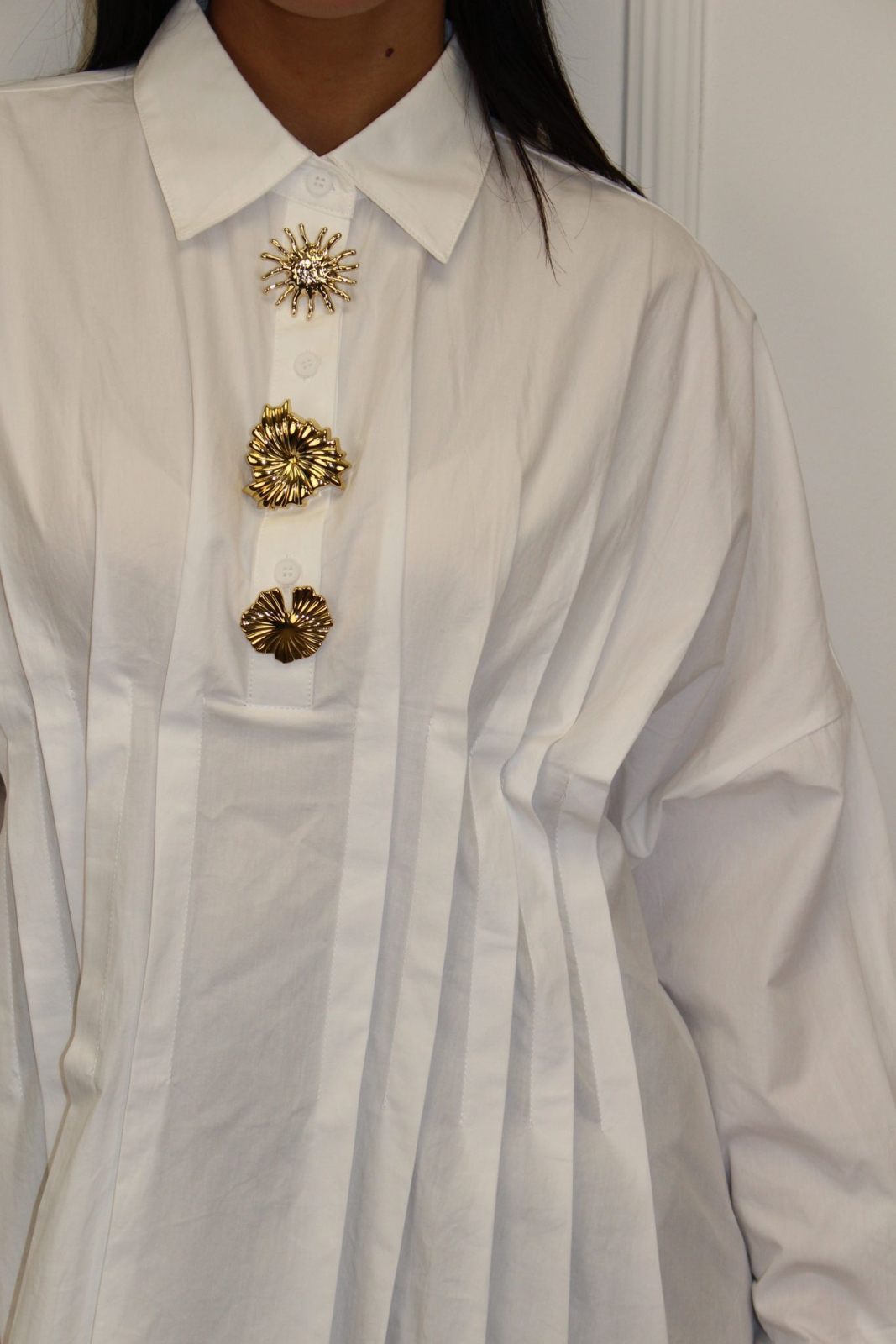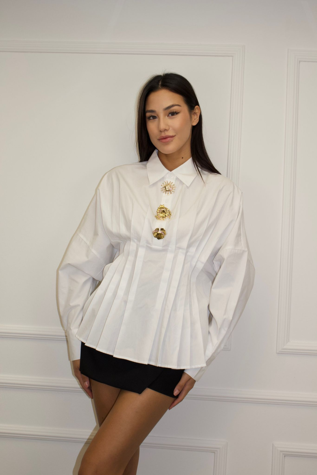 Бяла риза с модерна кройка, изработена от качествен памук, която се откроява с изтънчения си дизайн. Моделът е с вертикални плисета, които подчертават елегантната линия на силуета, и е допълнен с три декоративни златни апликации, които придават допълнителен щрих изтънченост и оригиналност. Дългите ръкави и свободната кройка осигуряват комфорт и гъвкавост, като са идеални както за офис облекло, така и за специални поводи.