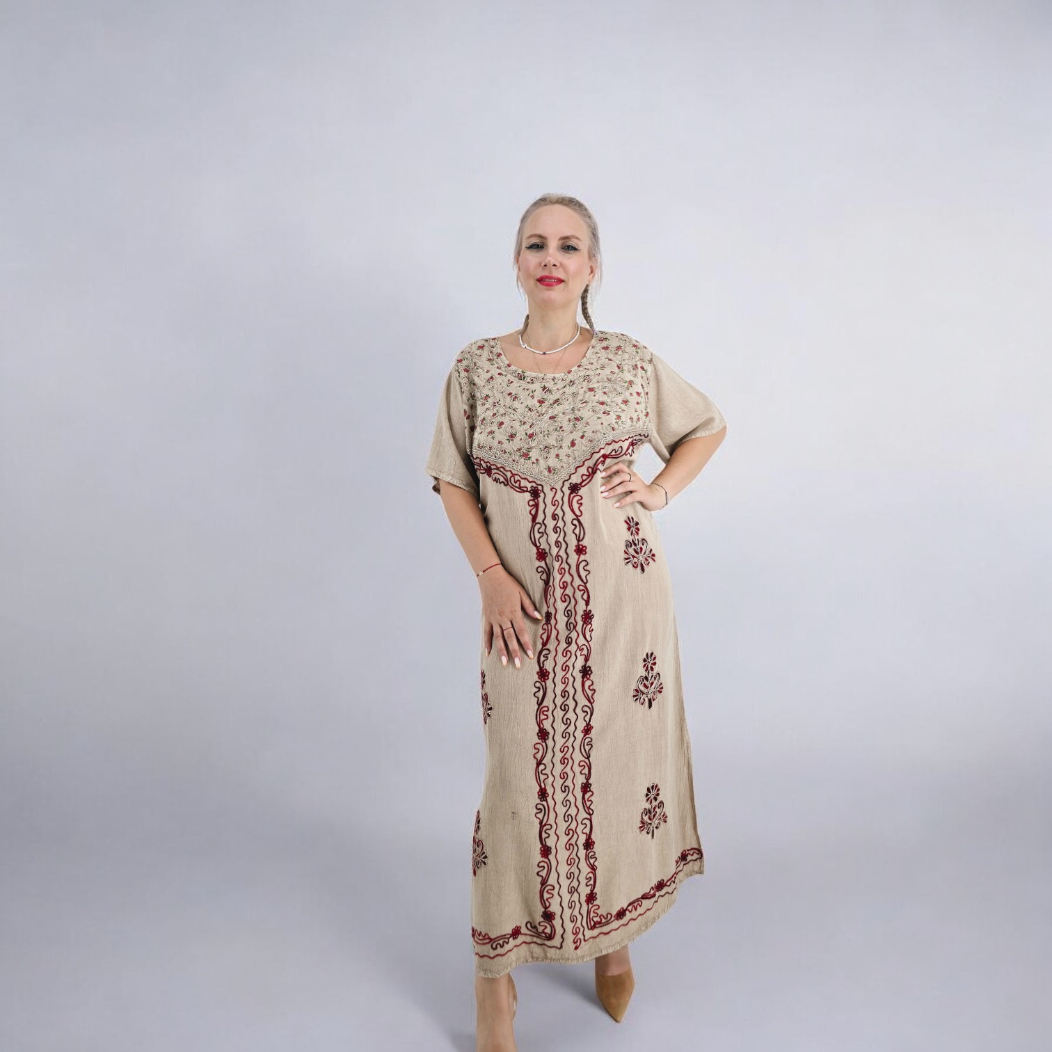 Rochie traditionala de culoare crem din vascoza, cu broderie cu modele traditionale florale. Decolteu rotund si maneci scurte. Rochie potrivita pentru toate siluetele cat si pentru viitoarele mamici