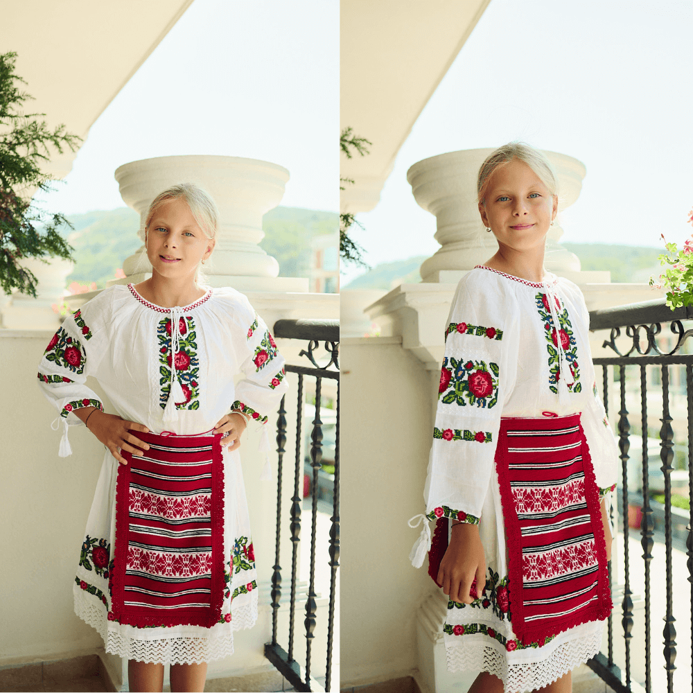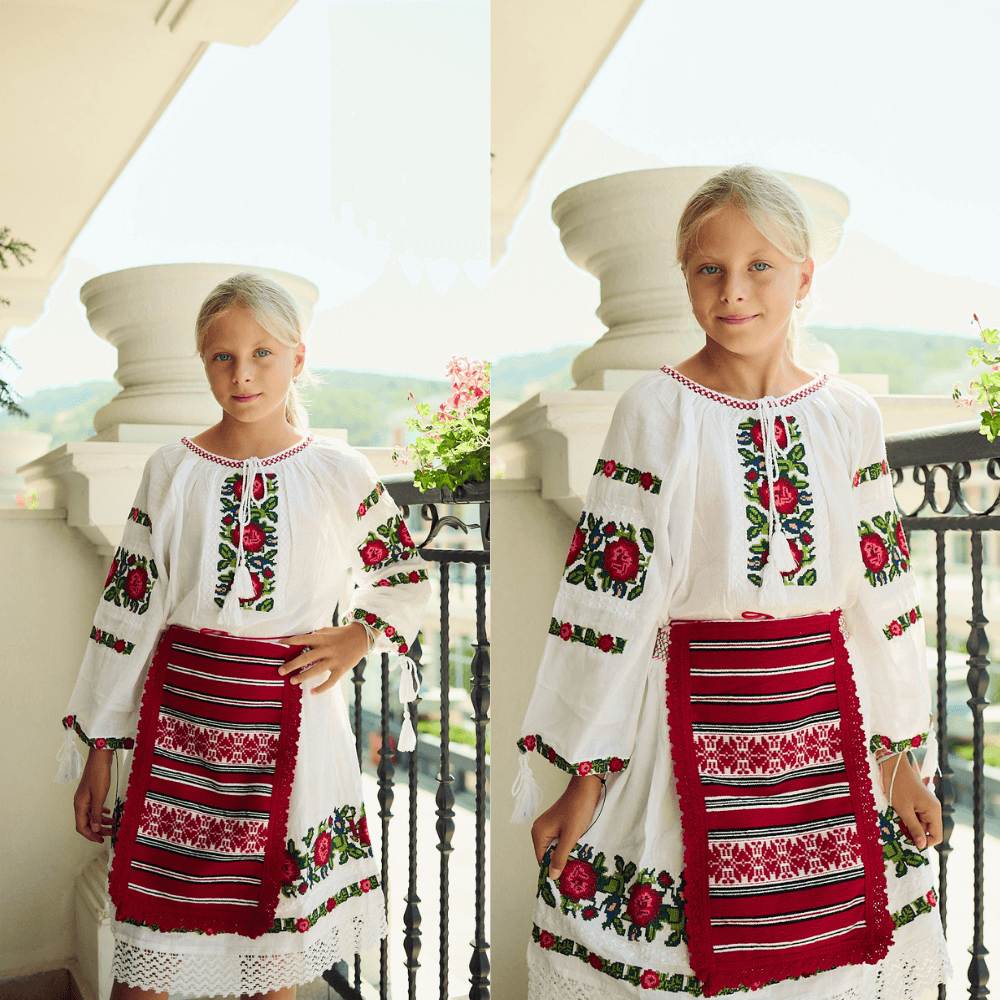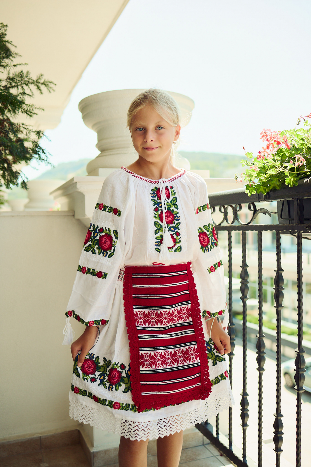 Катринжата е изработена от традиционен тъкан материал, с интензивен червен фон, декориран с черно-бели хоризонтални ивици, които се редуват хармонично. В централната част се откроява бял геометричен модел с традиционни мотиви, който добавя автентичност към изделието. Страничният ръб е рамкиран от семпла червена рамка, която подчертава целия дизайн. Катринжата се завързва дискретно на талията, перфектно допълвайки бялата ивица с флорална бродерия.