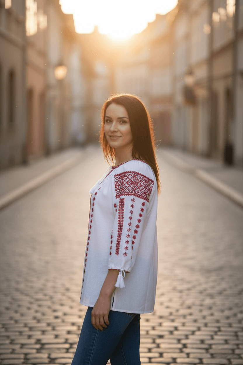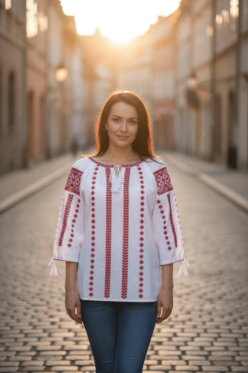 Тази румънска иа запазва автентичната красота на народната носия, преосмислена в модерна и универсална форма. Изработена от бял памучен плат, иа е украсена с червена бродерия, разположена вертикално, която визуално удължава силуета и предлага елегантен щрих.
