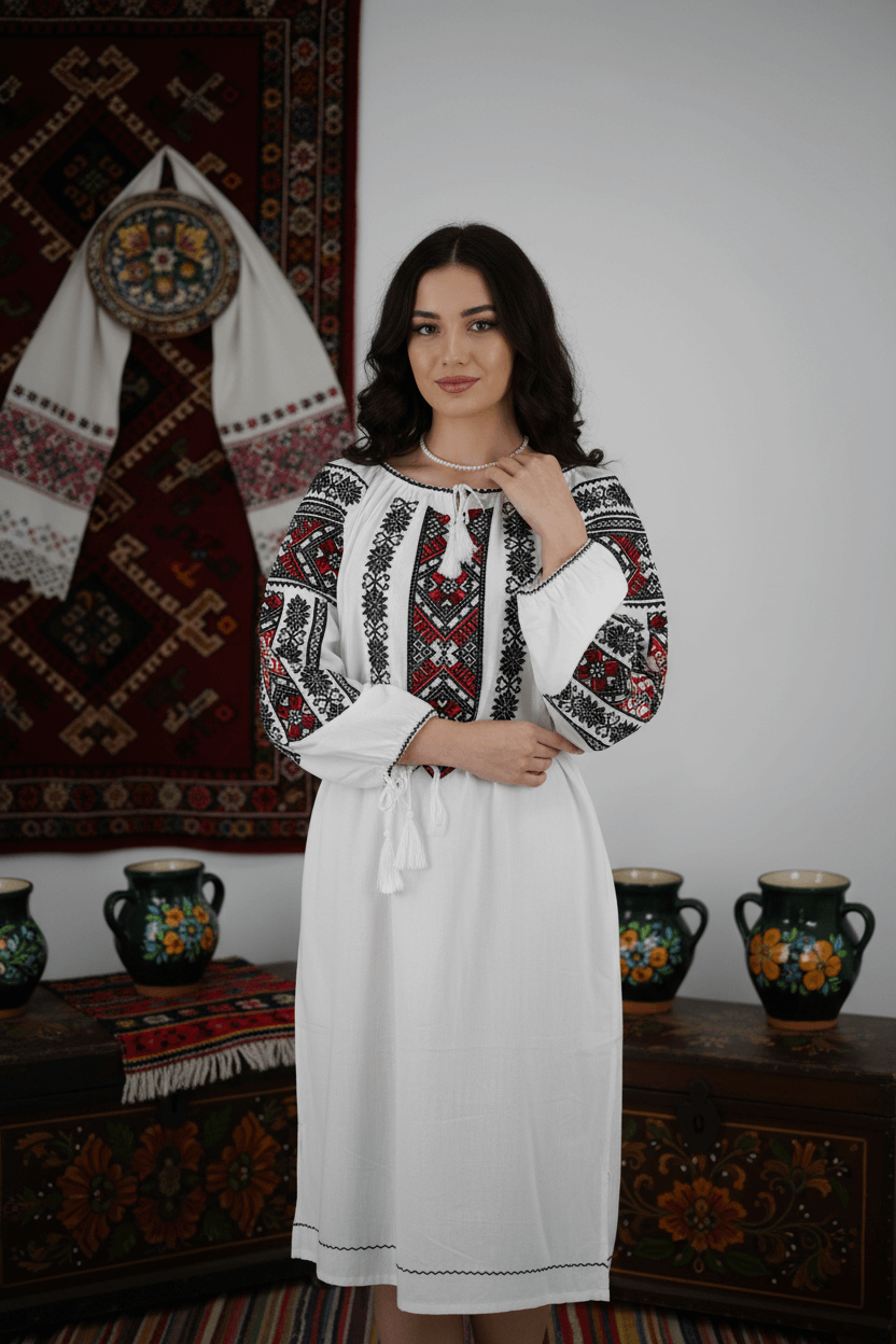Рокля от бял памук с бродерия с традиционни геометрични мотиви. Кръгло деколте и 3/4 ръкави. Има подплата. Роклята притежава бродерия както на предната част, така и отстрани и отзад (на подгъва)