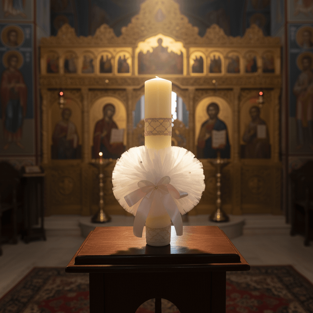 Бялата свещ за кръщене с тюл и сатенена панделка е символ на чистота и благословия. Изработена изцяло в нюанси на бялото, с дискретна дантела и ефирен тюл, тази свещ внася елегантен и тържествен щрих в момента на кръщението.