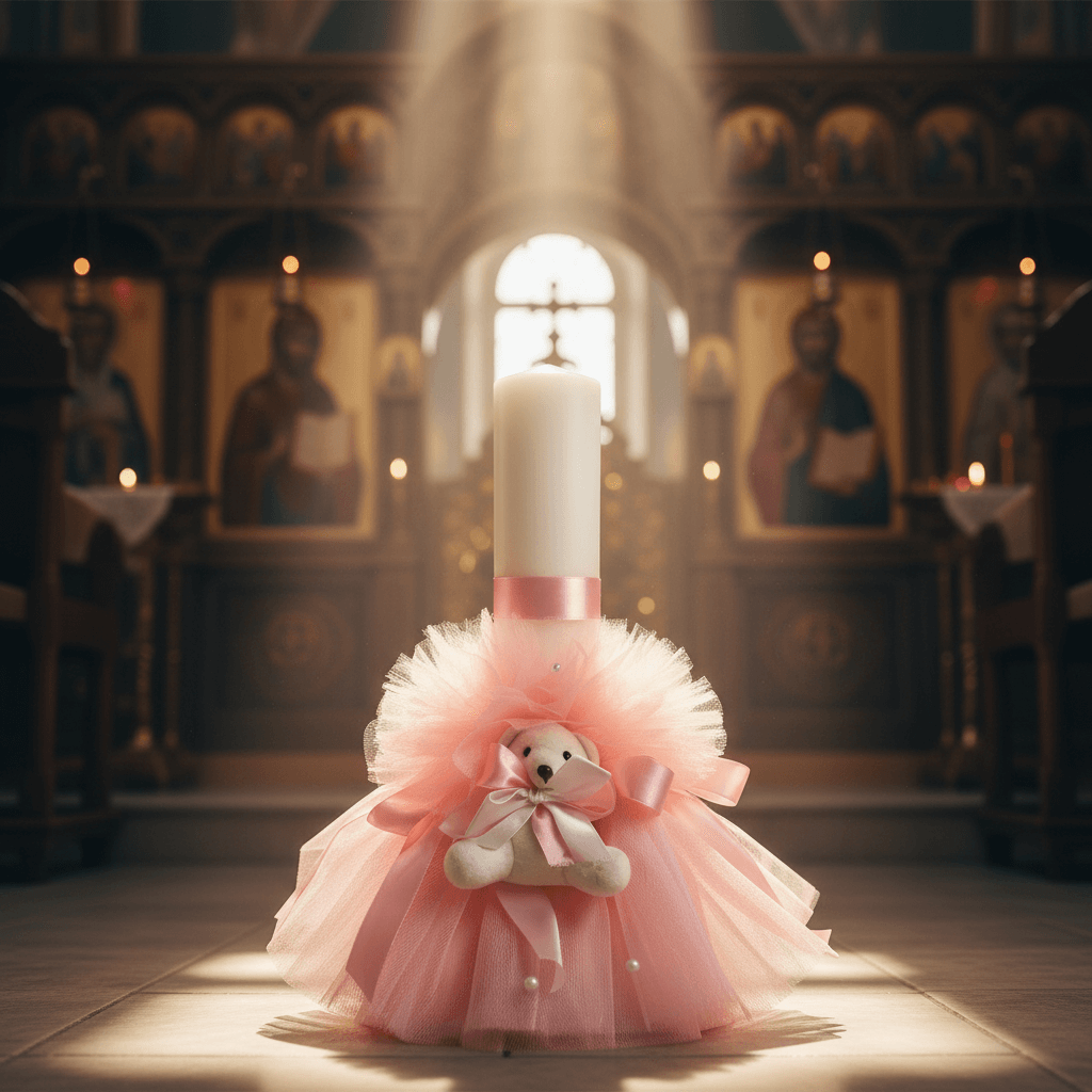 Розовата свещ за кръщене с плюшено мече е перфектният избор за церемония, изпълнена с нежност и цвят. Ръчно изработена, с бледорозов тюл, сатенена панделка и малко плюшено мече, забодено в средата, тази свещ носи усмивки и топлина в най-специалния ден от живота на мъничето, което се кръщава.