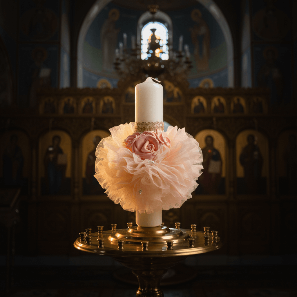 Свещта за кръщене с розови рози е символ на любовта и нежното начало на кръстеното дете. Ръчно декорирана с бледорозови сатенени цветя, парен тюл и елегантна златна дантела, тази свещ внася топъл и изискан щрих в церемонията по кръщене.