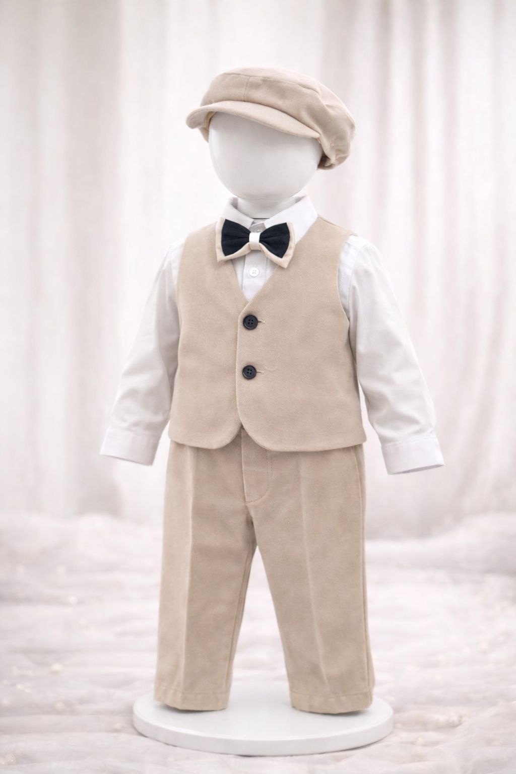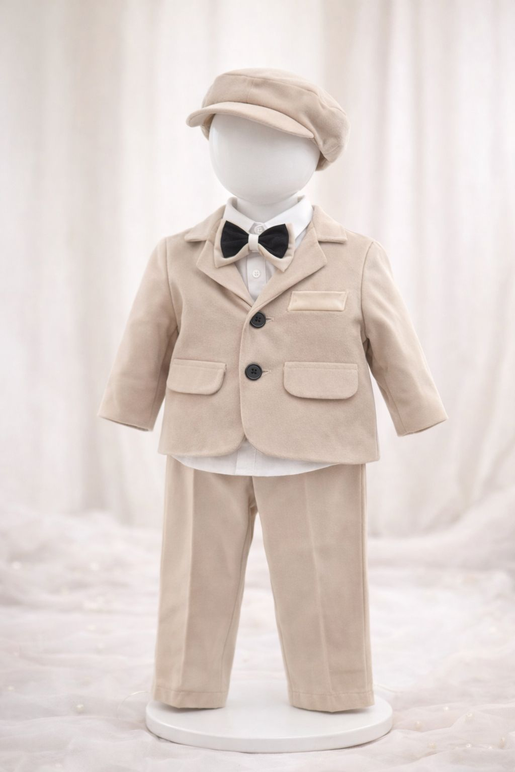 Изискан костюм за момчета, идеален за специални събития като кръщенета, рождени дни или фотосесии. Моделът съчетава елегантни нюанси на пастелно синьо и карамел, предлагайки едновременно изтънчен и модерен вид.