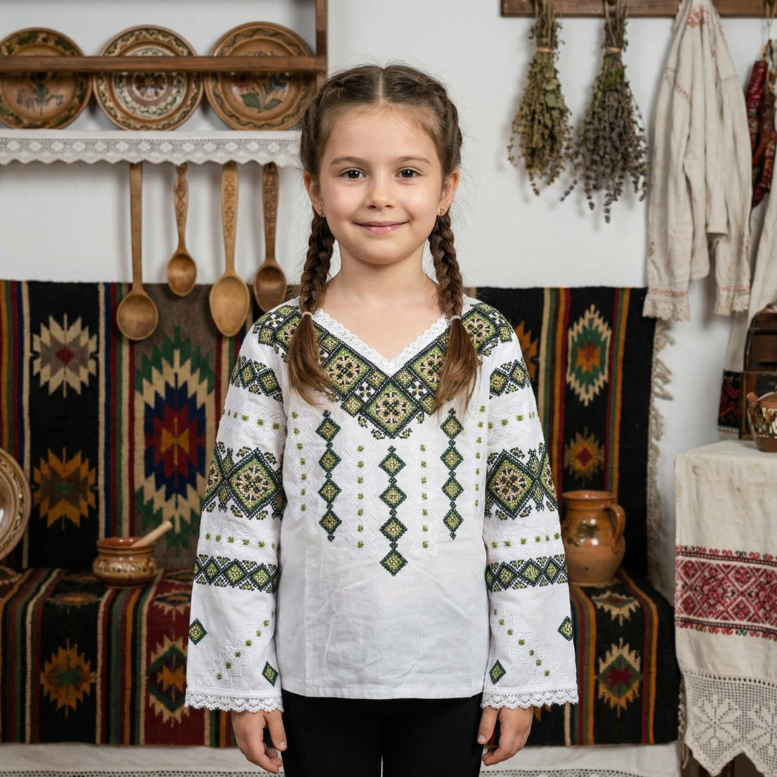Aceasta ie traditionala pentru fetite, numita 'Larisa', este confectionata din bumbac de calitate superioara, oferind confort si respirabilitate. Designul sau este inspirat din traditiile romanesti, fiind bogat ornamentat cu motive florale rosii si verzi, care simbolizeaza viata si renasterea naturii. Motivele sunt dispuse simetric pe partea frontala si pe maneci, accentuand eleganta si echilibrul vizual. La baza gatului, ia este prevazuta cu un snur alb cu ciucuri, adaugand un plus de autenticitate. Manecile sunt lungi, cu mansete dantelate, conferind un aspect rafinat si sofisticat. Aceasta ie este ideala pentru evenimente speciale sau pentru a adauga un strop de traditie garderobei micutei tale. Originara din zona Olteniei, ia 'Larisa' reflecta in totalitate mestesugul si pasiunea pentru arta textilelor traditionale romanesti.