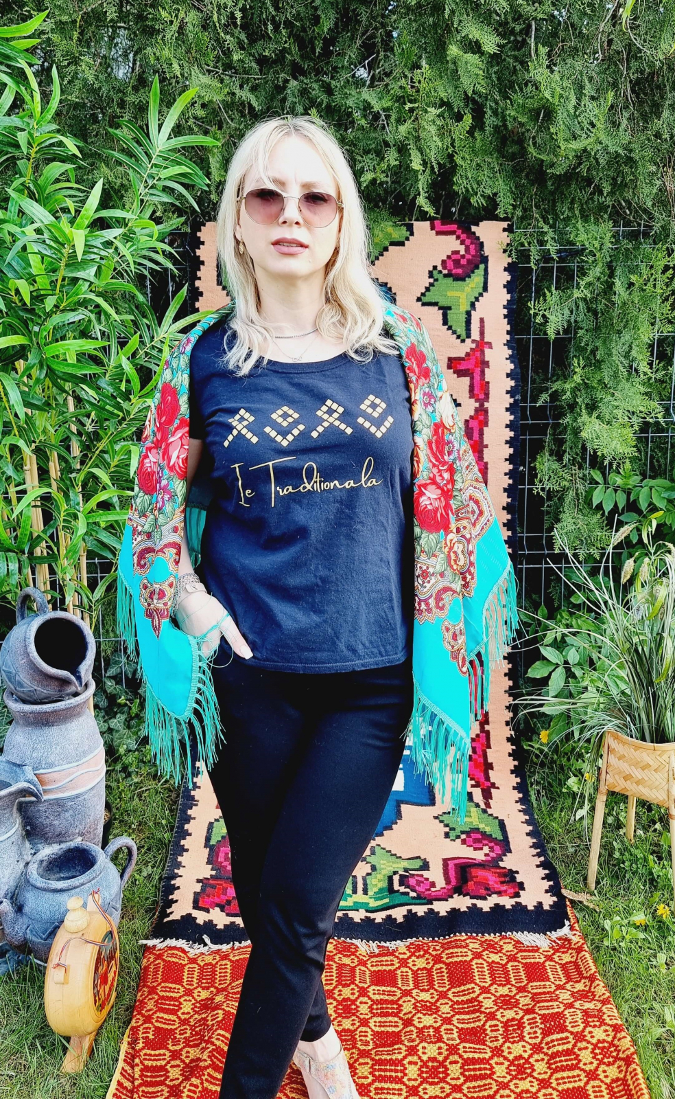 Batic etno mare negru Bujori sau Esarfa lunga cu motive florale .