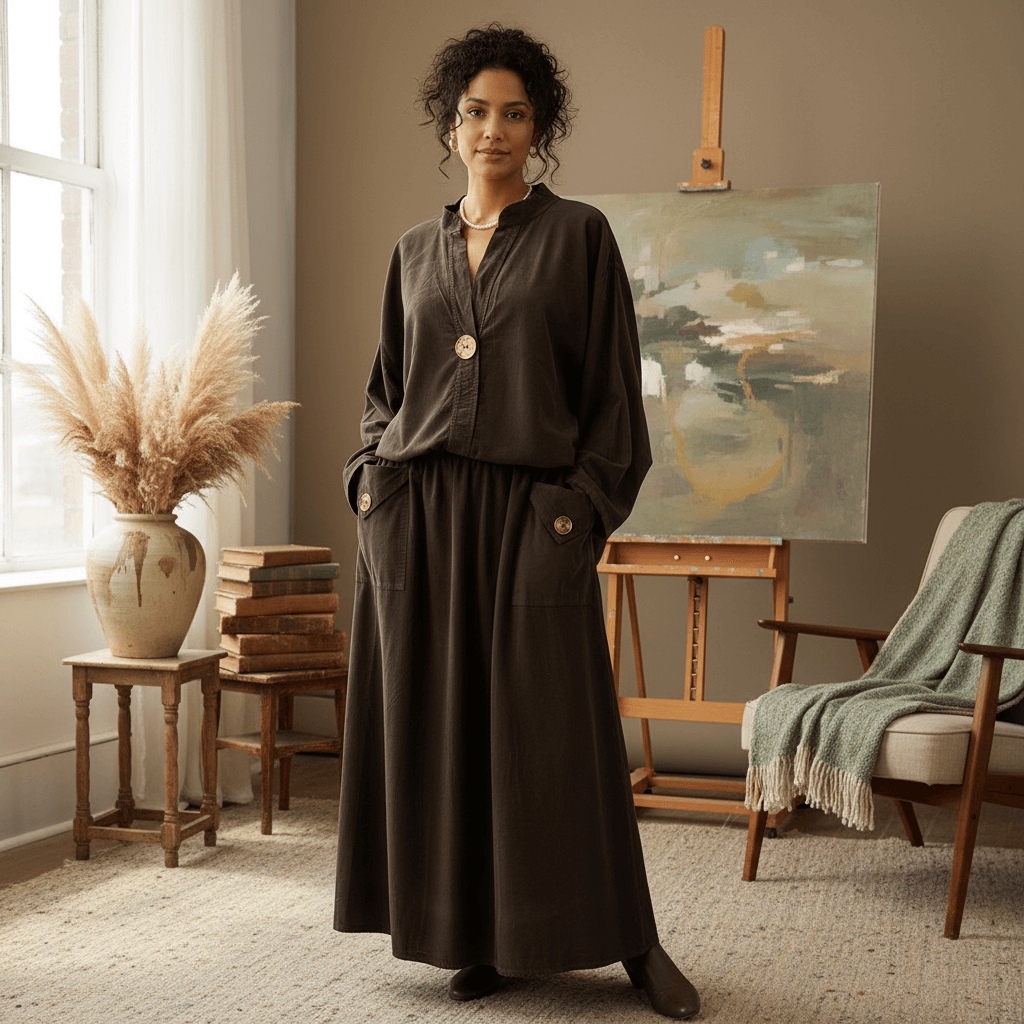 Acest compleu maro inchis din material raiat îmbină perfect confortul cu rafinamentul simplu al unei ținute naturale. Bluza are o croială lejeră, cu o circumferință a bustului de 125 cm și o lungime de 61 cm, fiind potrivită pentru o purtare relaxată și elegantă.