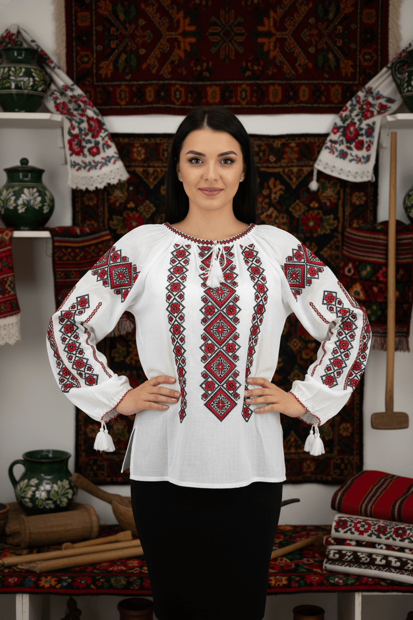 Experimentează adevărata frumusețe a României cu Sandica, o ie populară tradițională care este foarte apreciata datorita broderiei geometrice !