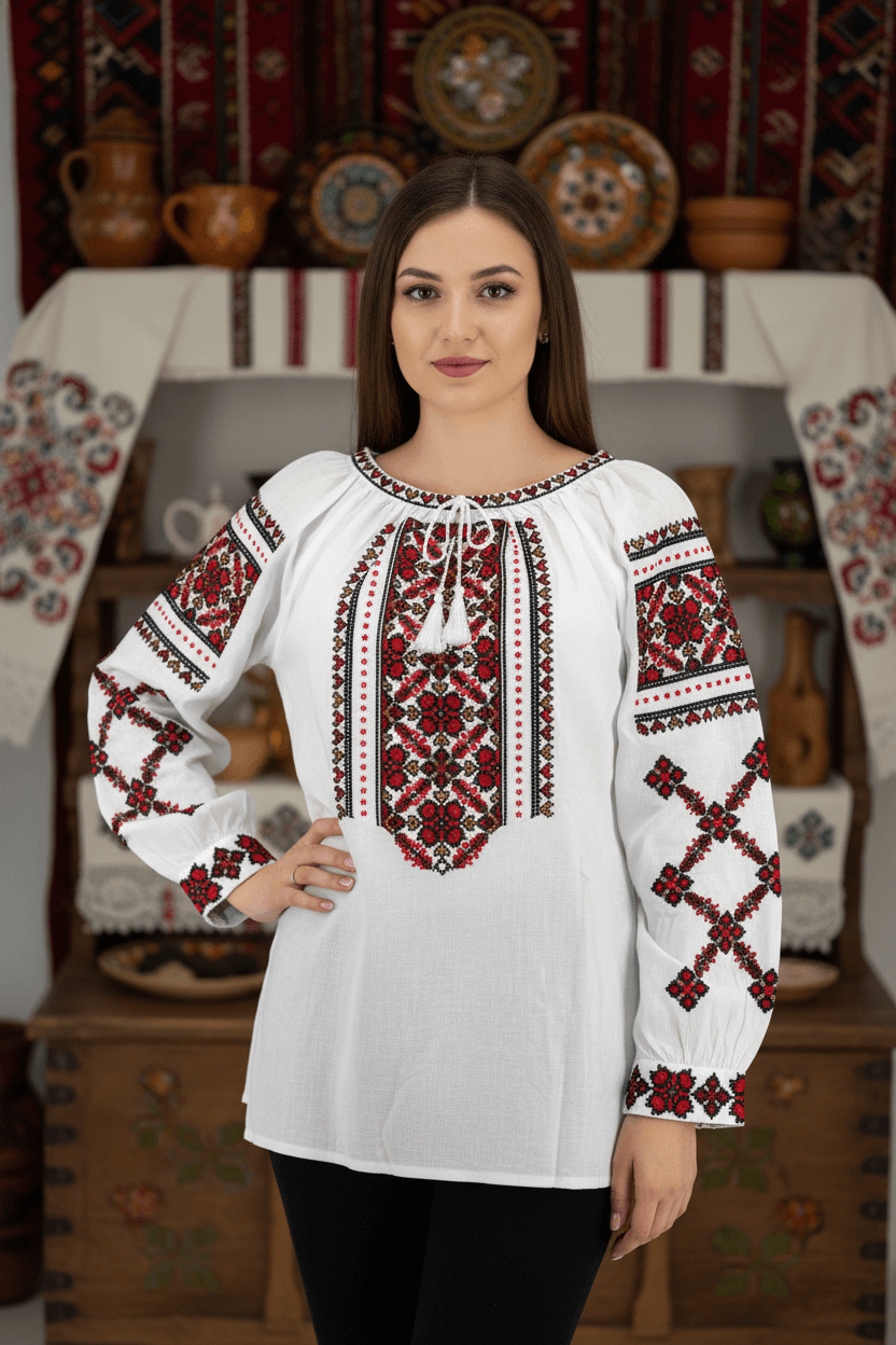 Experimentează adevărata frumusețe a României cu Sandica, o ie populară tradițională care este foarte apreciata datorita broderiei geometrice !