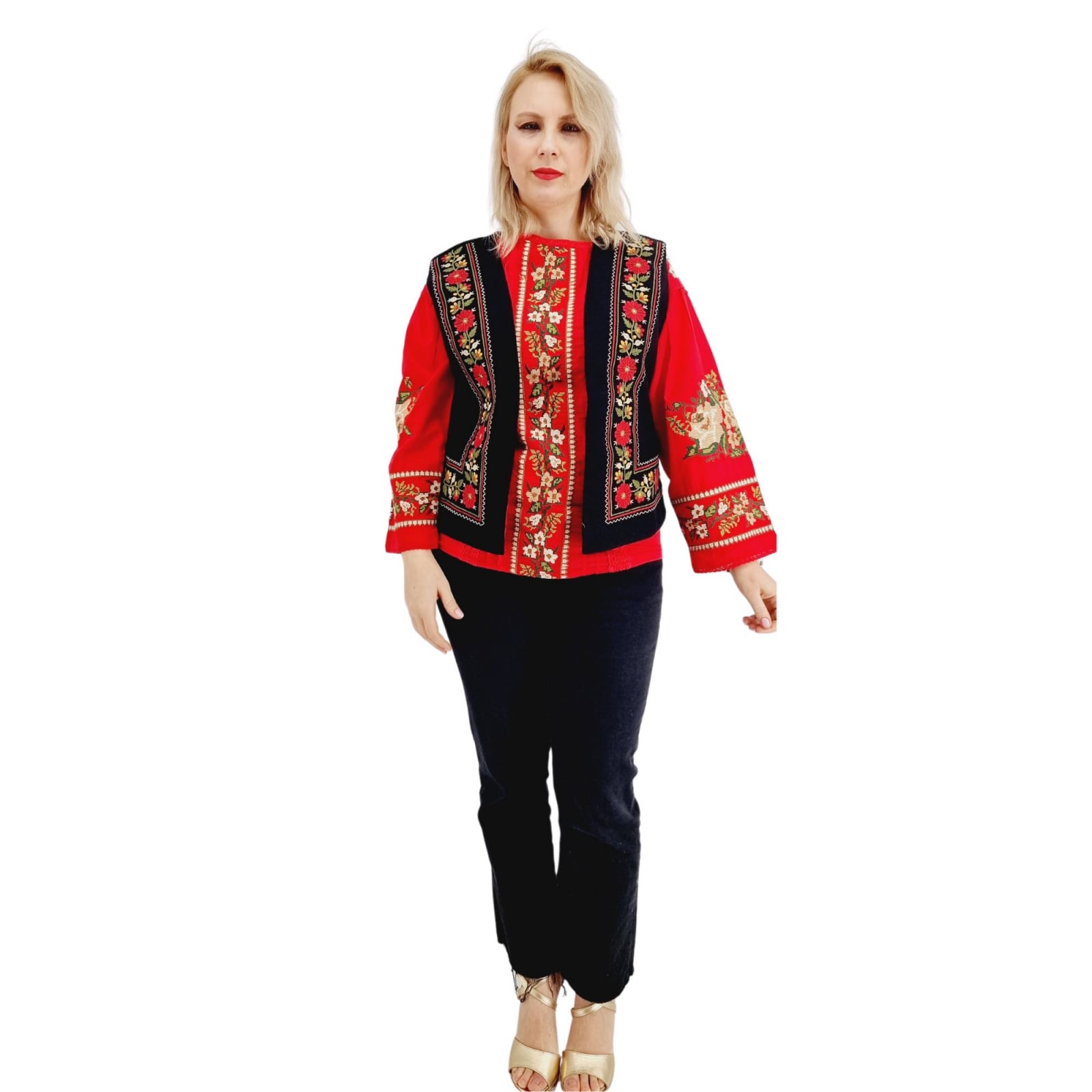 Vesta dama frumos brodata, la masina de cusut. Broderia reprezinta motive florale , iar culoarea la baza este negru.