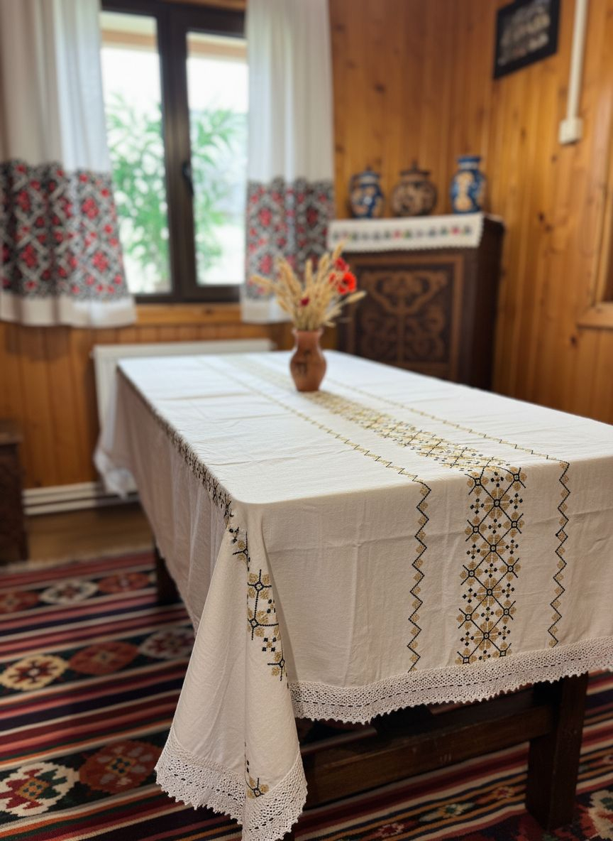 Față de masă tradițională din bumbac, cu motive românești și dantelă decorativă, disponibilă în două dimensiuni.150 cm lățime și 245 cm lungime