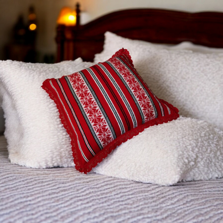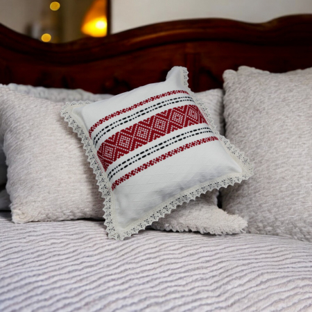 Față de pernă tradițională (50x50 cm) cu modele geometrice roșu-negru și margine din dantelă. Fără umplutură, ideală pentru un decor autentic și elegant.