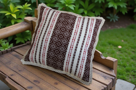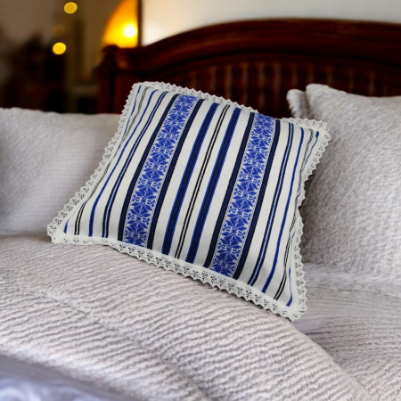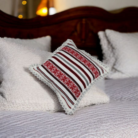 Îmbogățește decorul casei tale cu această față de pernă pătrată (50x50 cm), decorată cu modele geometrice tradiționale românești în nuanțe de alb, roșu și negru. Detaliile elegante sunt puse în valoare de marginea fină din dantelă, adăugând un plus de delicatețe și rafinament. Această față de pernă este perfectă pentru un colț de relaxare autentic, cu influențe din meșteșugurile românești.