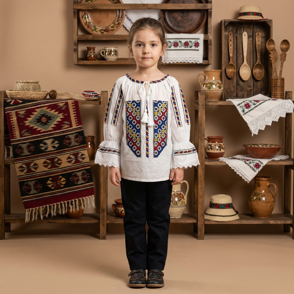 Ie traditionala pentru fetite, model Daria, confectionata din bumbac de calitate superioara, ofera un confort sporit si o senzatie placuta la atingere. Aceasta ie se remarca prin broderiile sale complexe, inspirate din motivele traditionale romanesti, specifice zonei Transilvaniei. Culorile vii, precum rosu, albastru si galben, sunt alese cu grija pentru a reflecta bogatia culturala si artistica a regiunii. Broderiile sunt plasate strategic pe piept, maneci si guler, conferind un aspect armonios si echilibrat. Manecile sunt largi si se termina cu dantela fina, adaugand un plus de eleganta si rafinament. Acest model de ie este perfect pentru diverse ocazii, fie ele festive sau casual, oferind o nota autentica si traditionala oricarei tinute.