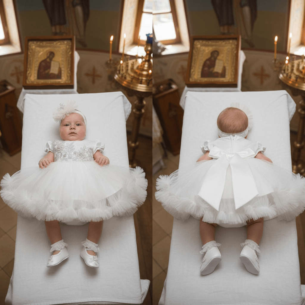 Setul include și o bentiță asortată cu floare decorativă, completând ținuta într-un stil unic, plin de puritate și grație. Potrivită atât pentru botez, cât și pentru ședințe foto sau aniversări.