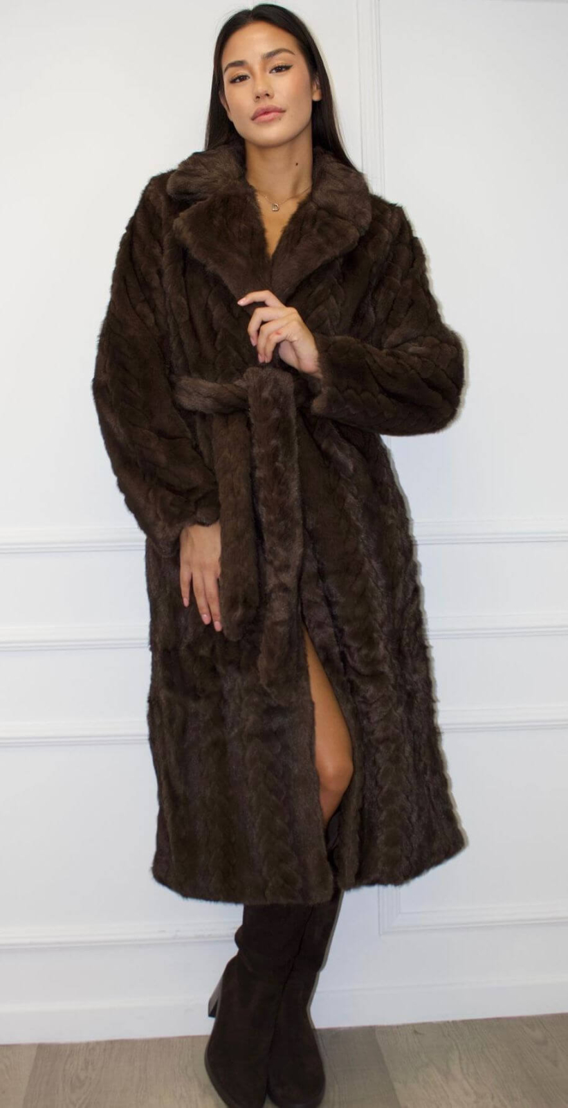 Eleganță, rafinament și confort – toate într-o singură piesă! Acest palton lung din blană ecologică maro ciocolatiu este alegerea perfectă pentru zilele reci în care vrei să impresionezi prin stil. Materialul moale și dens oferă o senzație plăcută la purtare, iar cordonul subliniază frumos talia, creând o siluetă feminină și sofisticată.
