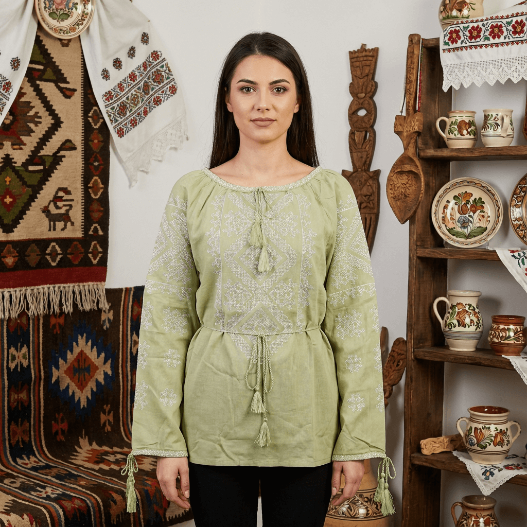 Ie traditionala romaneasca de culoare verde cu broderie alb, cu motive geometrica