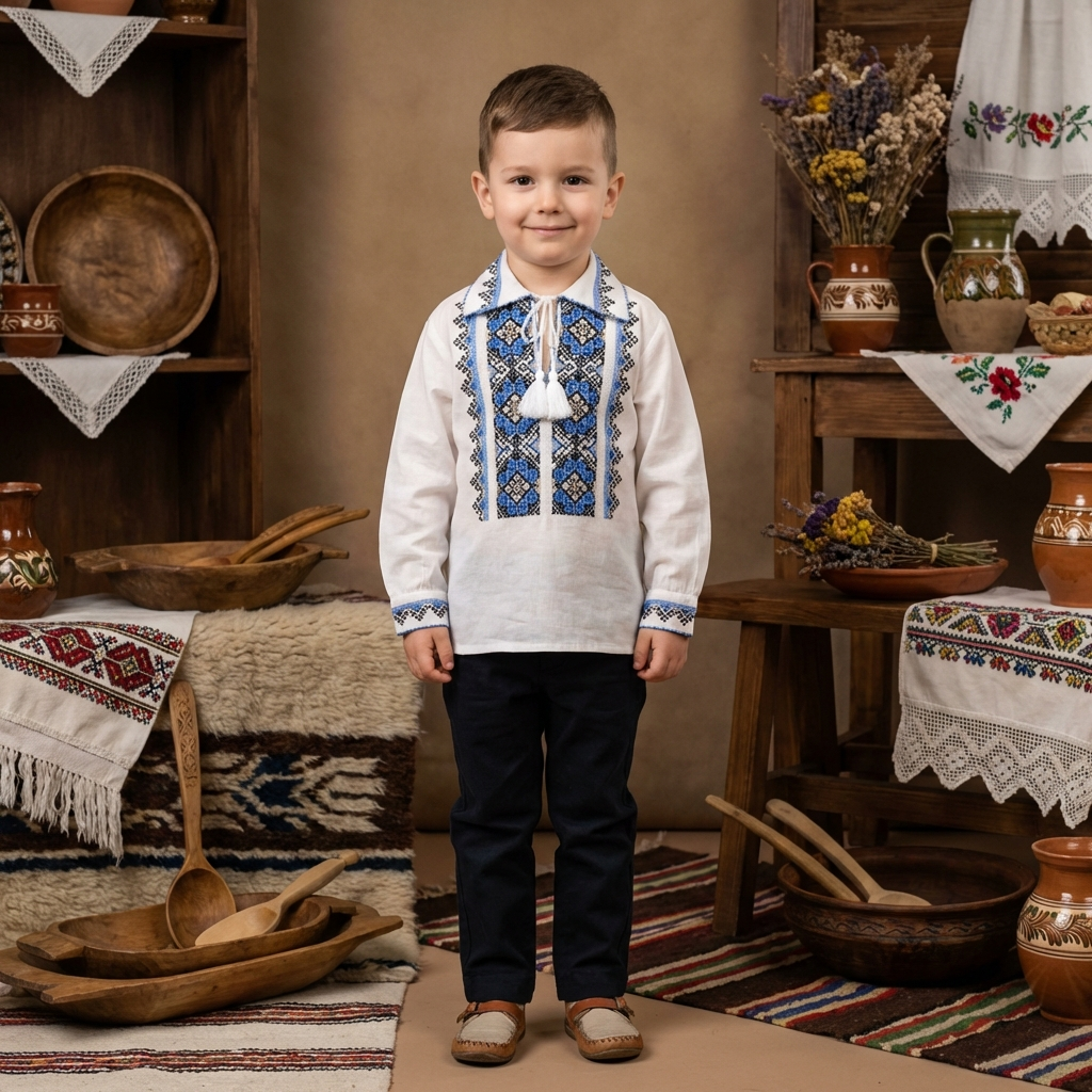 Ie traditionala pentru baieti Mihail este o piesa vestimentara ce aduce in prim-plan cultura autentica romaneasca, fiind ideala pentru evenimentele cu specific traditional. Confectionata din bumbac de inalta calitate, aceasta ie asigura confort si respirabilitate, fiind potrivita pentru pielea sensibila a celor mici. Designul iei este accentuat de broderii complexe, realizate in nuante de albastru si negru, ce simbolizeaza cerul si pamantul, elemente des intalnite in arta populara romaneasca. Motivele geometrice sunt specifice zonei Transilvania, cunoscuta pentru detaliile sale meticuloase si bogatia culturala. Gulerul rotund si mansetele sunt finisate cu broderii subtile, oferind un plus de eleganta. Aceasta ie poate fi asortata cu usurinta la diverse tinute, fiind un element versatil in garderoba oricarui baiat.