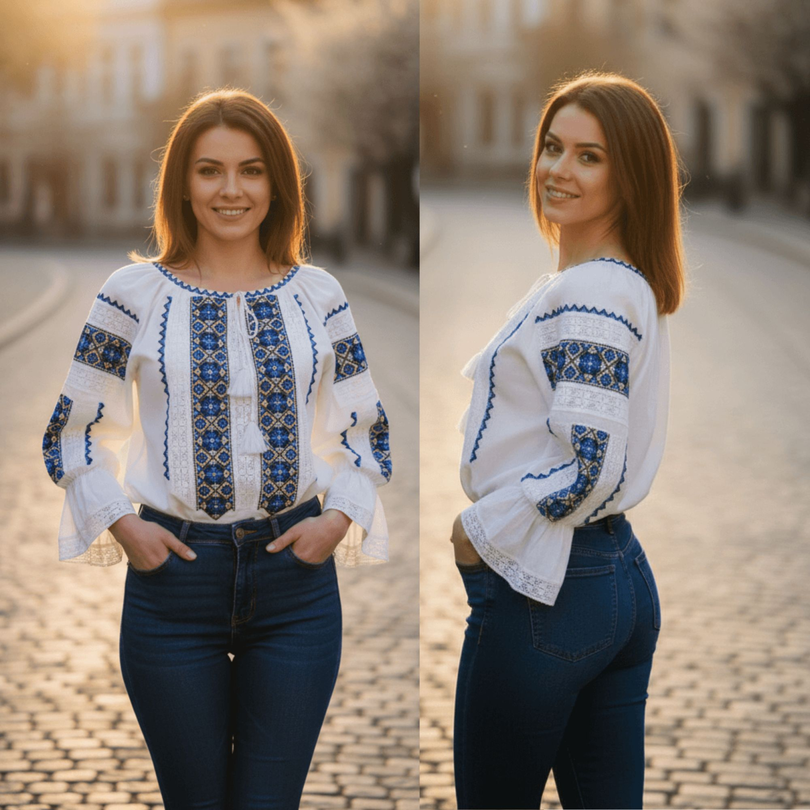 Ie stilizata traditionala romaneasca de culoare alb cu broderie alb cu motive insipirate din natura - floral