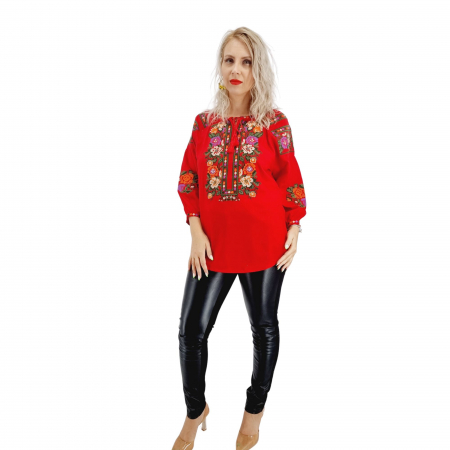 Ie stilizata traditionala romaneasca de culoare rosie cu broderie colorata cu motive insipirate din natura
