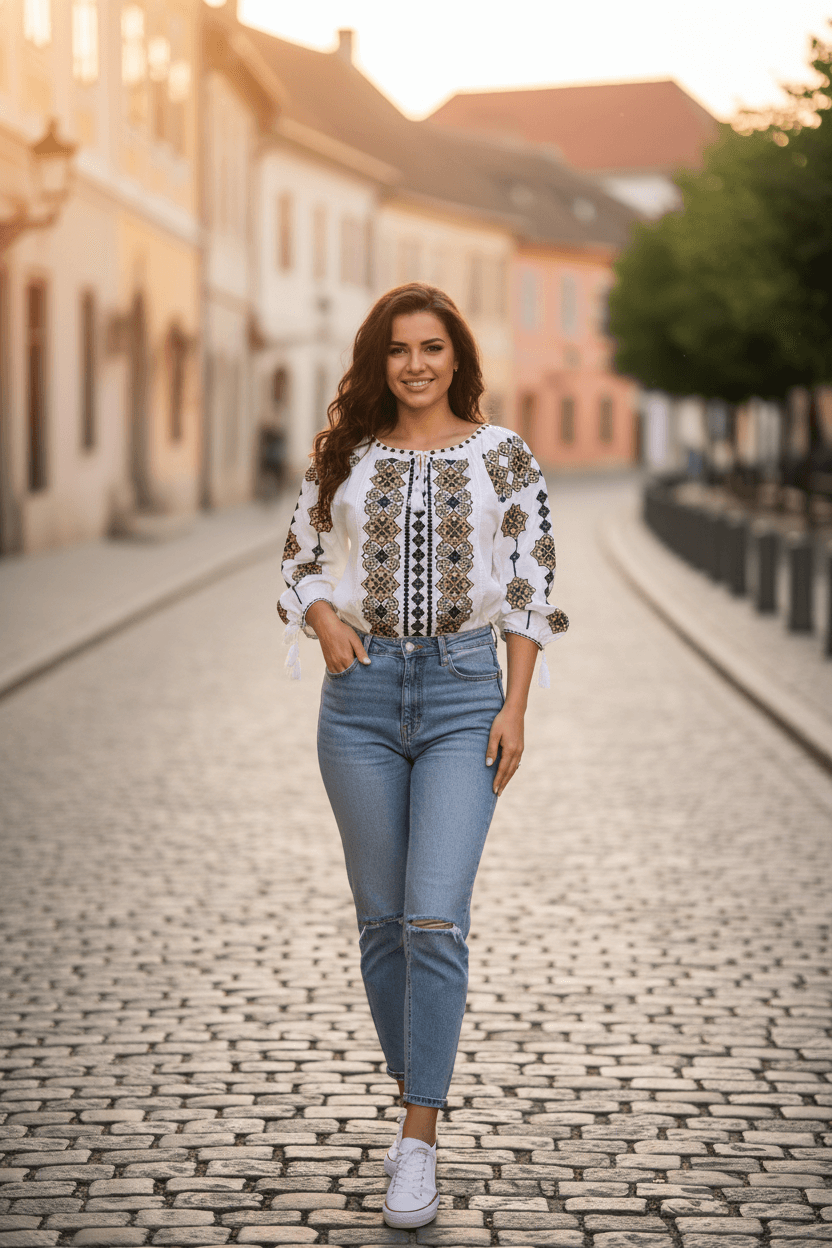Este o ie tradițională românească, brodată cu măiestrie. Designul este complex, evidențiind detalii fine și modele tradiționale care amintesc de bogăția și diversitatea culturii românești. Culorile vii și armonioase se îmbină perfect cu fondul alb al iei, creând un contrast vizual plăcut. Broderia la mașină oferă un aspect autentic și tradițional, transformând această ie într-o operă de artă vestimentară. Îmbrăcând această ie, purtătorul său va reflecta cu mândrie tradițiile și patrimoniul românesc.