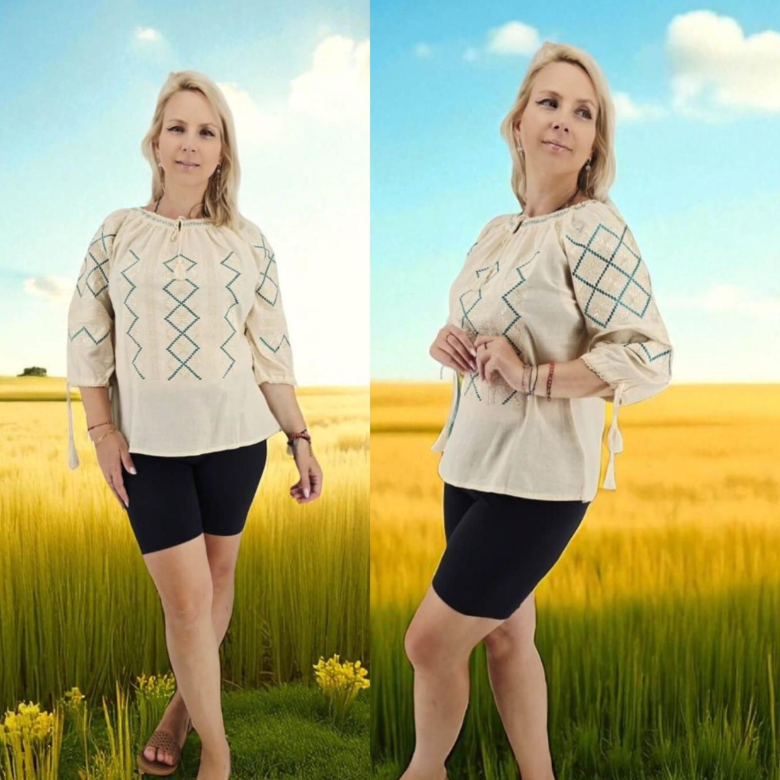 Ie stilizata traditionala romaneasca de culoare crem cu broderie crem si turcoaz