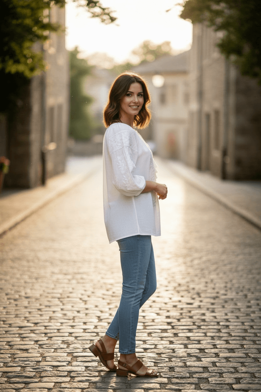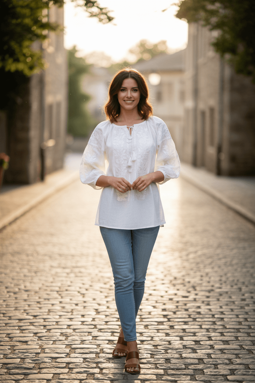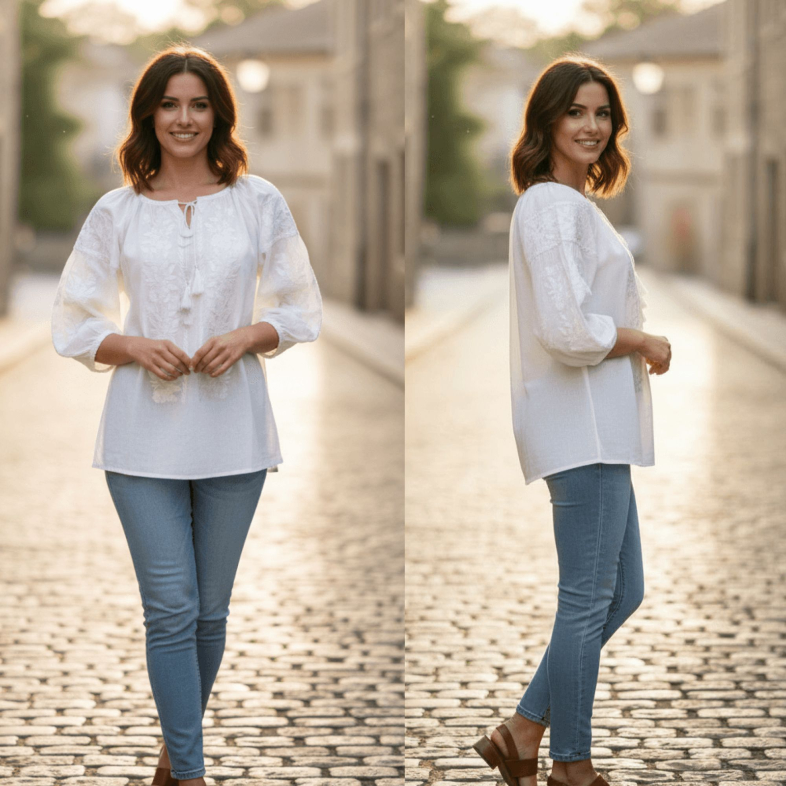 Ie stilizata traditionala romaneasca de culoare alb cu broderie alb cu motive insipirate din natura - geometric