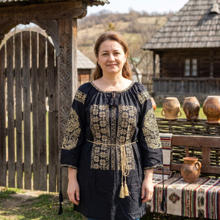 Ie stilizata traditionala romaneasca de culoarenegru cu broderie crem cu motive insipirate din natura - floral
