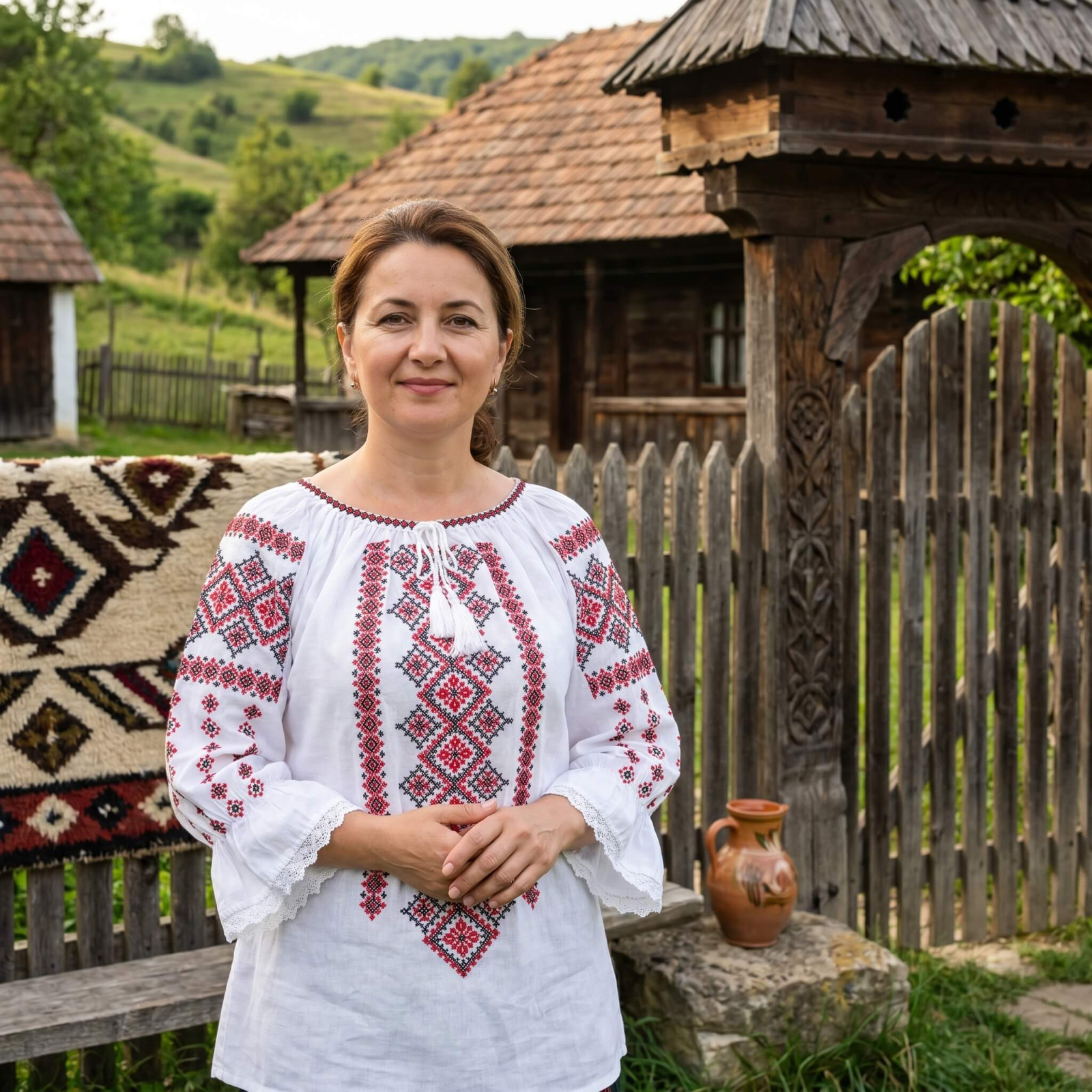 Ie traditionala romaneasca de culoare alba cu broderie rosie cu motive geometrice