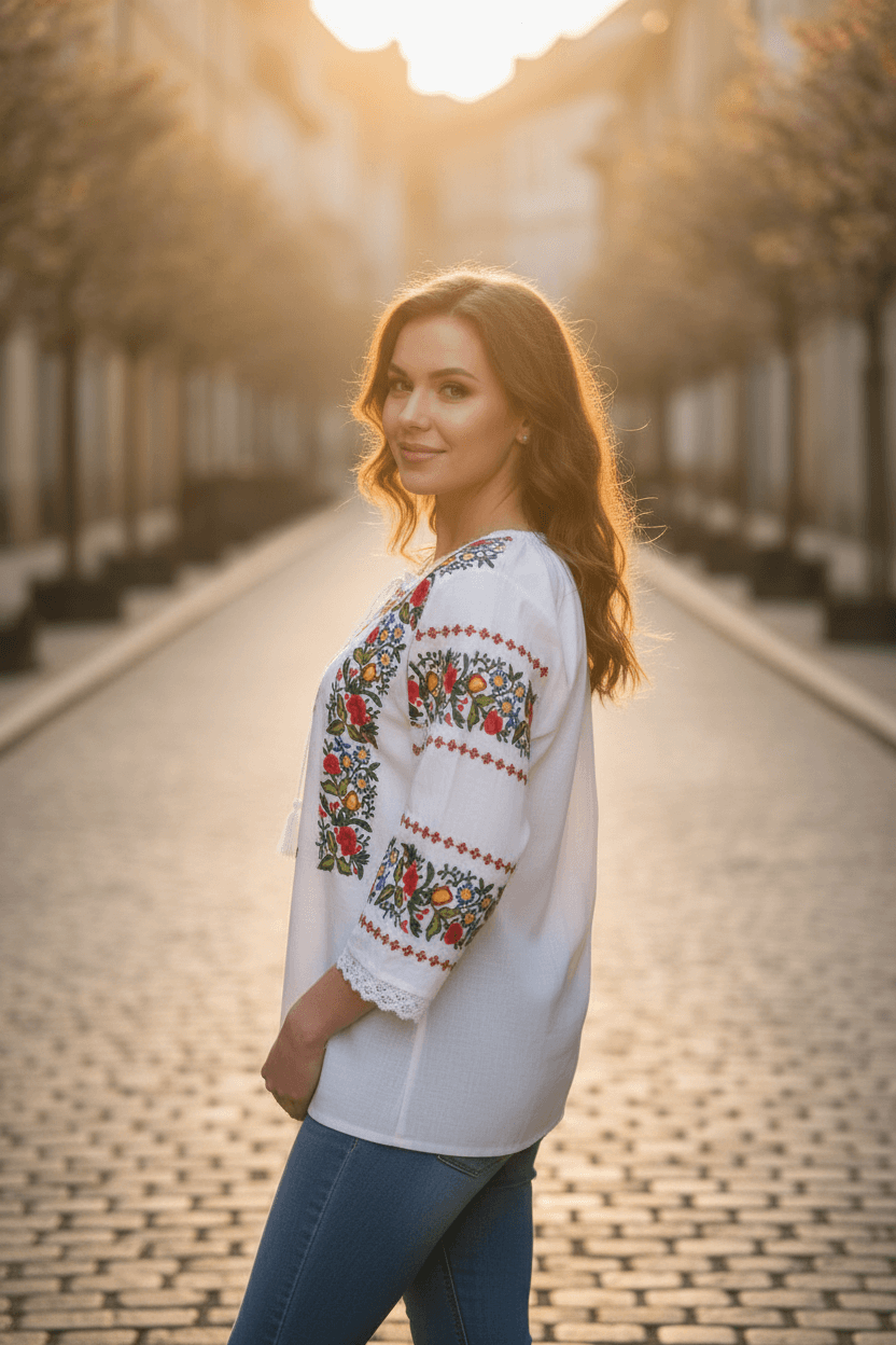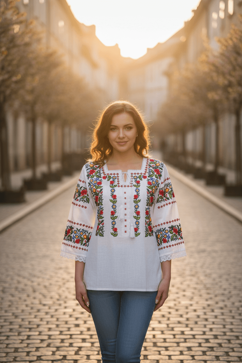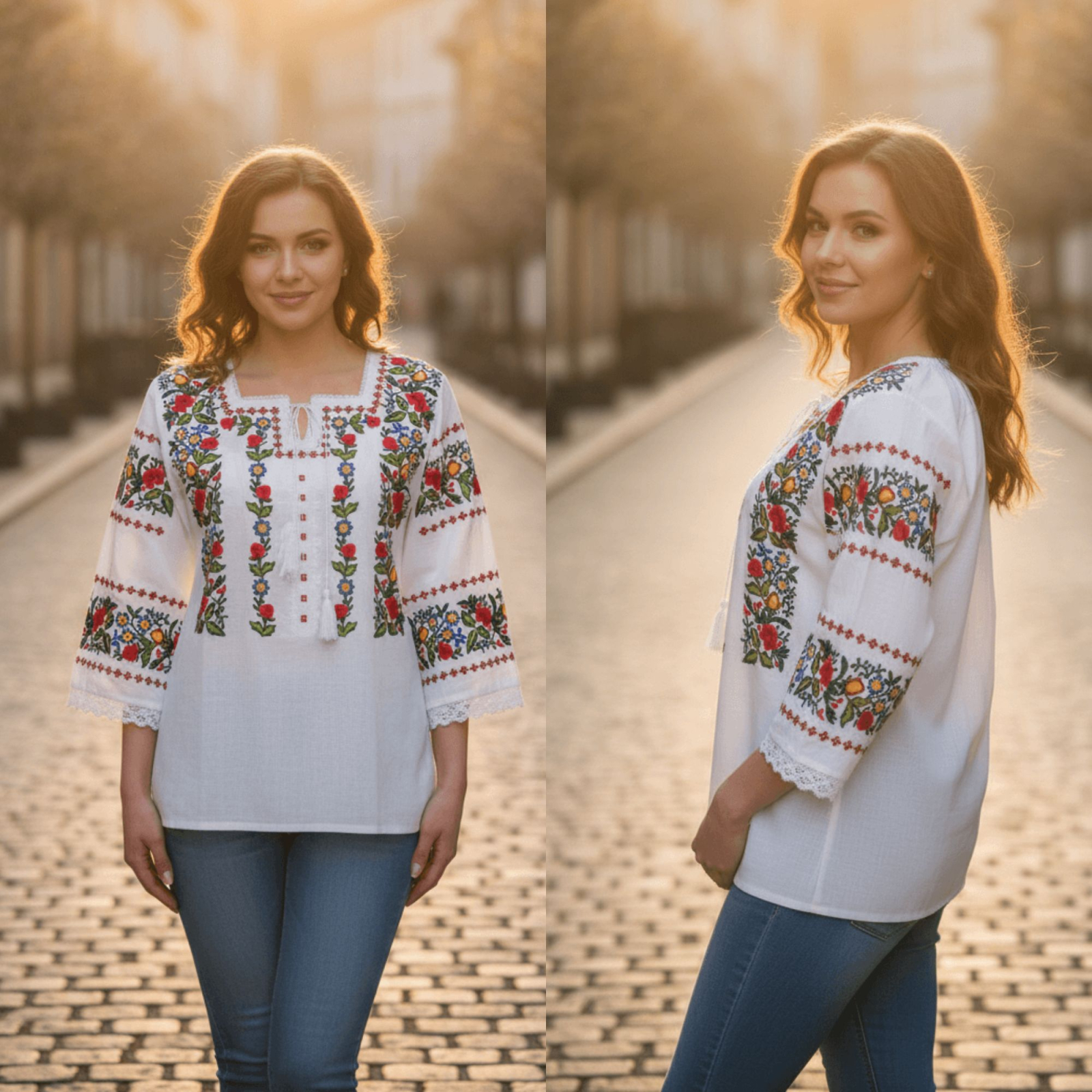 Această ie tradițională, este o piesă vestimentară autentică, inspirată din tradițiile românești. Realizată cu măiestrie și atenție la detalii, această ie este o adevărată operă de artă. Broderia mecanica, cu motive florale și geometrice, adaugă un plus de eleganță și rafinament piesei. Materialele de calitate superioară, precum bumbacul, asigură confort și durabilitate. Cu un design clasic și versatil, această ie se potrivește perfect atât pentru ocazii speciale, cât și pentru ținute casual.