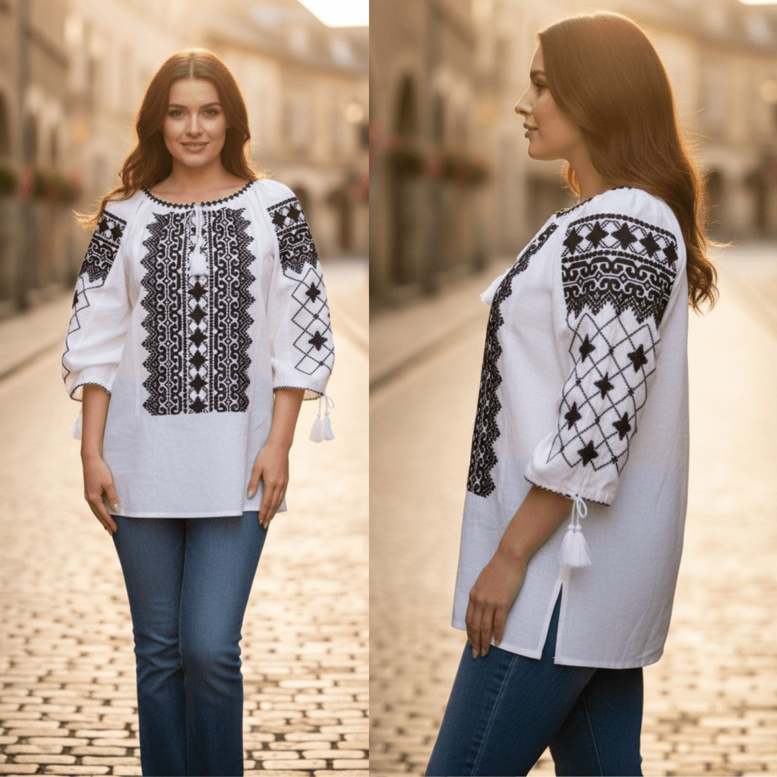 Ie stilizata traditionala romaneasca de culoare alba cu broderie colorata cu motive geometrice culoare negru