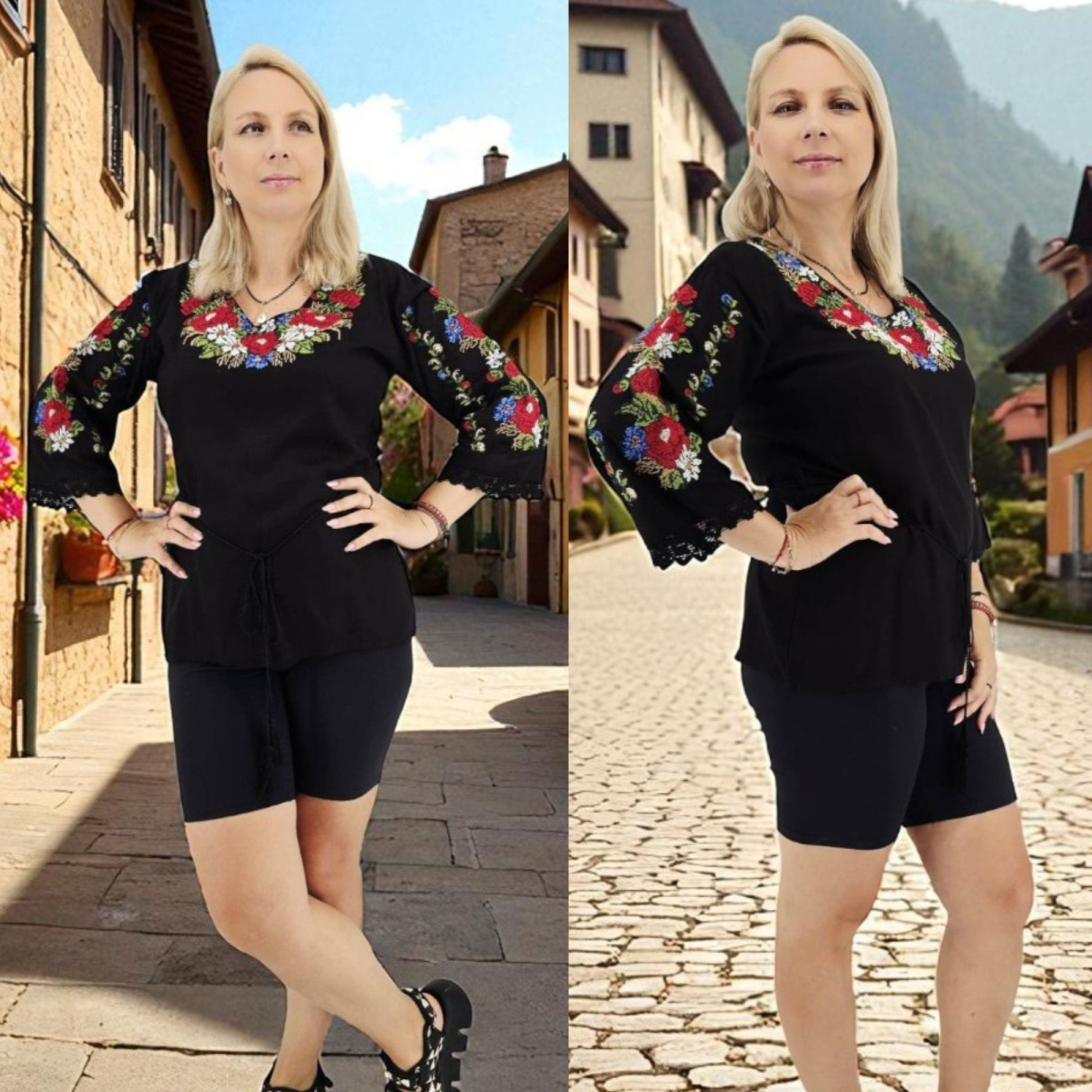 👉 Modelul din imagine are 160 cm, 63 kg, 92 cm bust și poartă mărimea M.