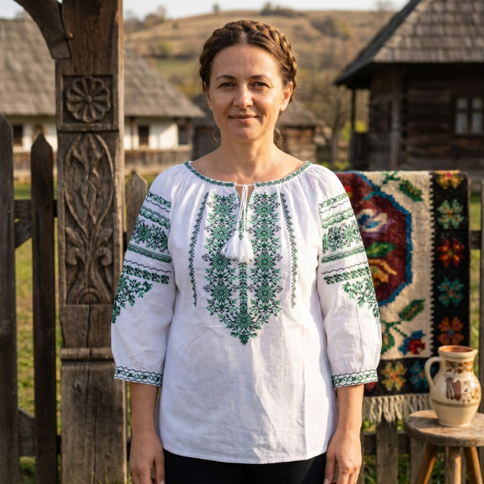 Experimentează adevărata frumusețe a României cu Victoria, o ie populară tradițională care este foarte apreciata datorita broderiei geometrica!