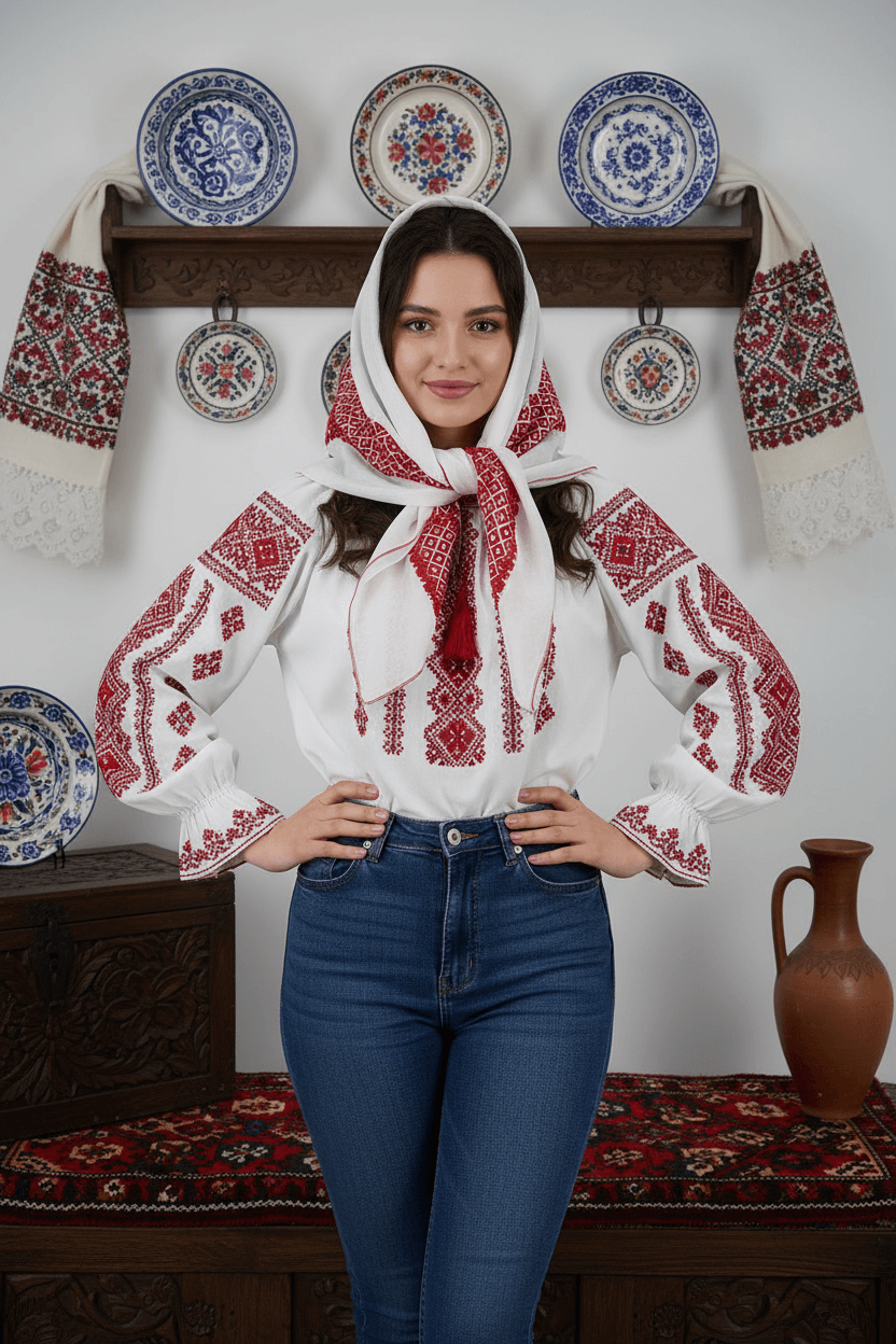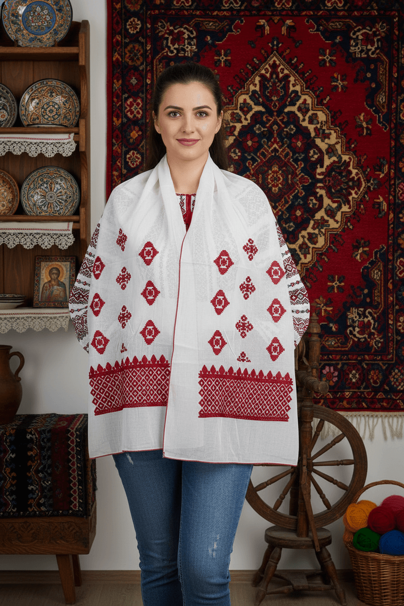 Marama alb cu broderie traditionala, confectionata cu multa grija ca tu sa fi unica in orice combinatie de haine pe care ai purta-o