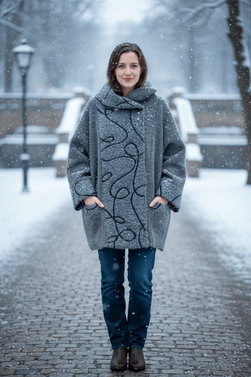 Această jachetă gri, confecționată dintr-un material moale și plăcut la atingere, îți oferă o senzație de căldură chiar și în cele mai reci zile. Croiala sa largă îți asigură libertate de mișcare și un aer elegant, modern.